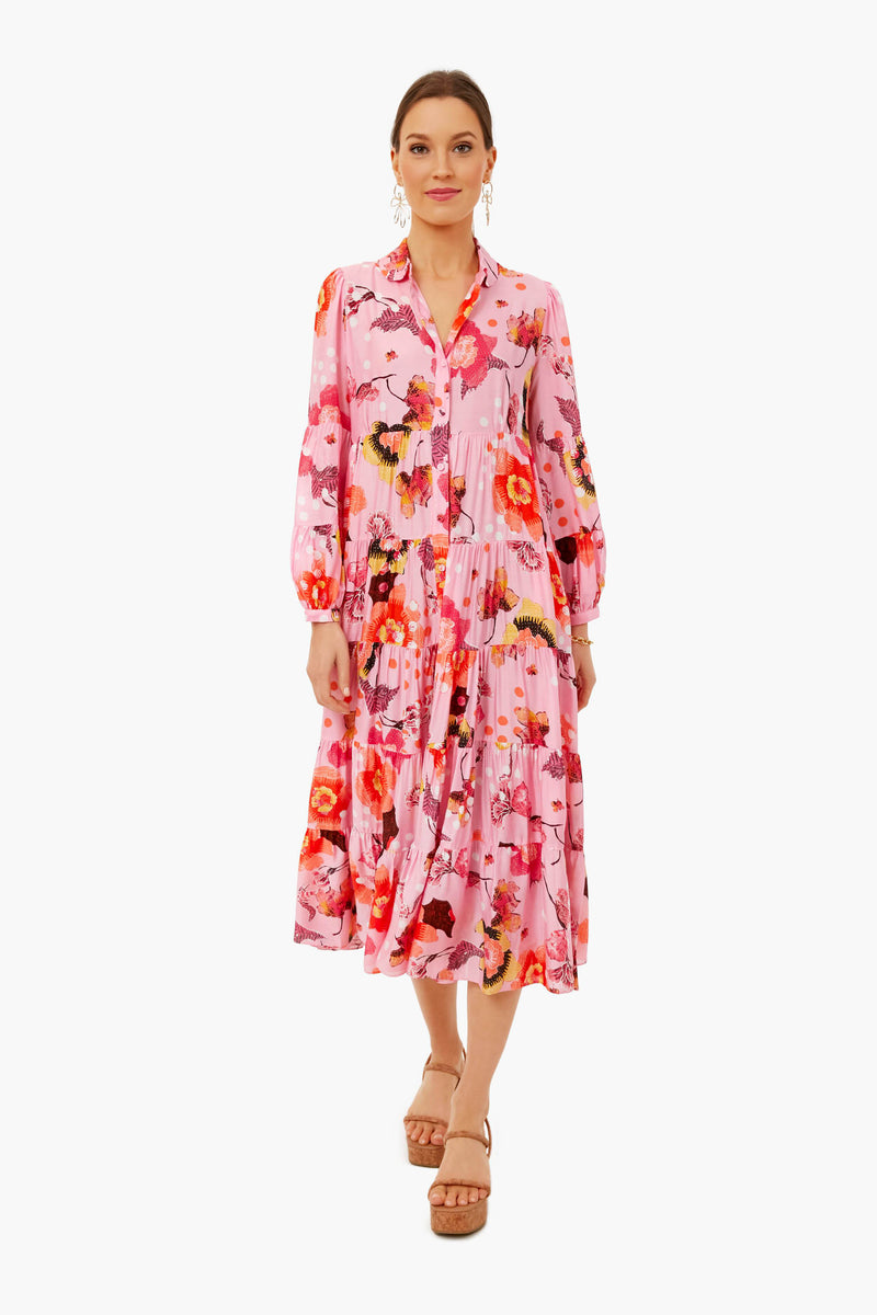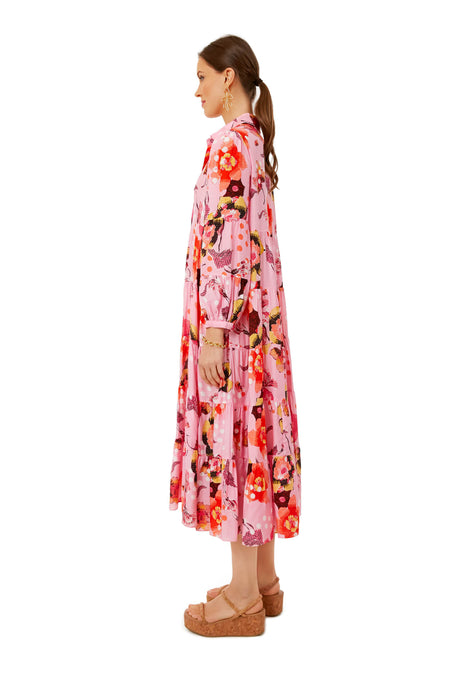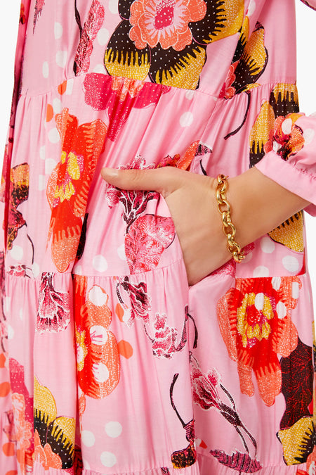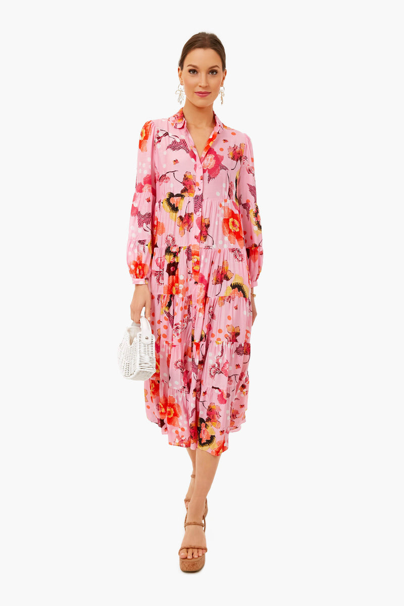 The perfect shirt dress for any occasion- this silk-rayon midi is cut with a flowy oversized shape, full tiered skirt, and buttons up the front. Slip into this breezy silhouette for a day at home, brunch, or add glitzy accessories for a dressier event.