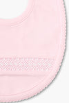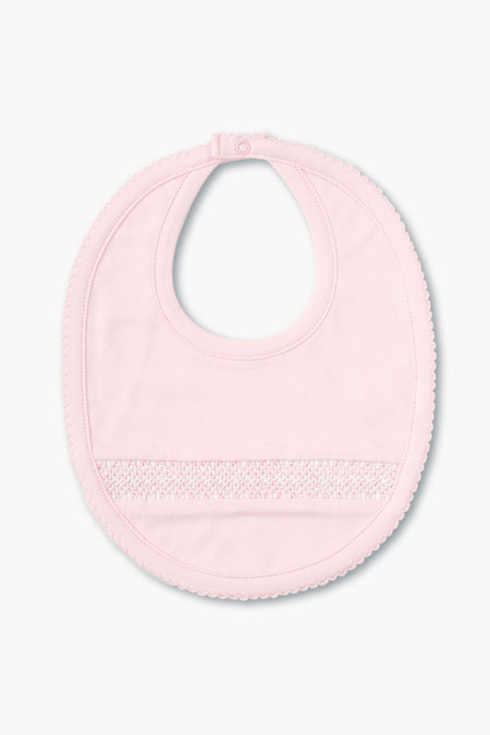 Perfect for catching baby's mealtime messes, the Pink Hand Smocked Bib is a must-have in any household with little ones. A snap closure for easy on and off, as well as an absorbent terry cloth backing and smocked details make this equal parts cute and functional. Made from pima cotton with easy washing instructions, this is an item that you can feel great about your sweet kiddo using.