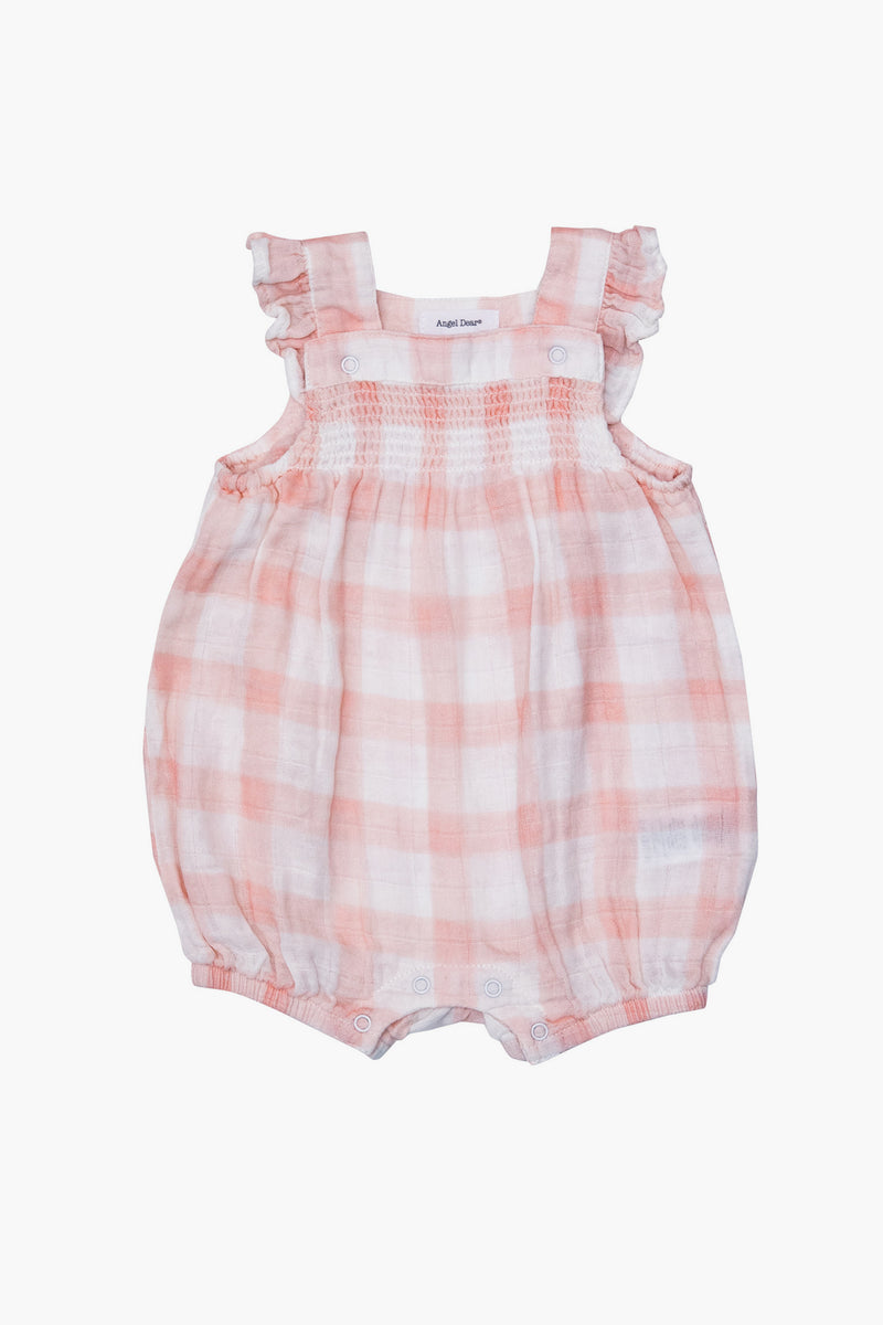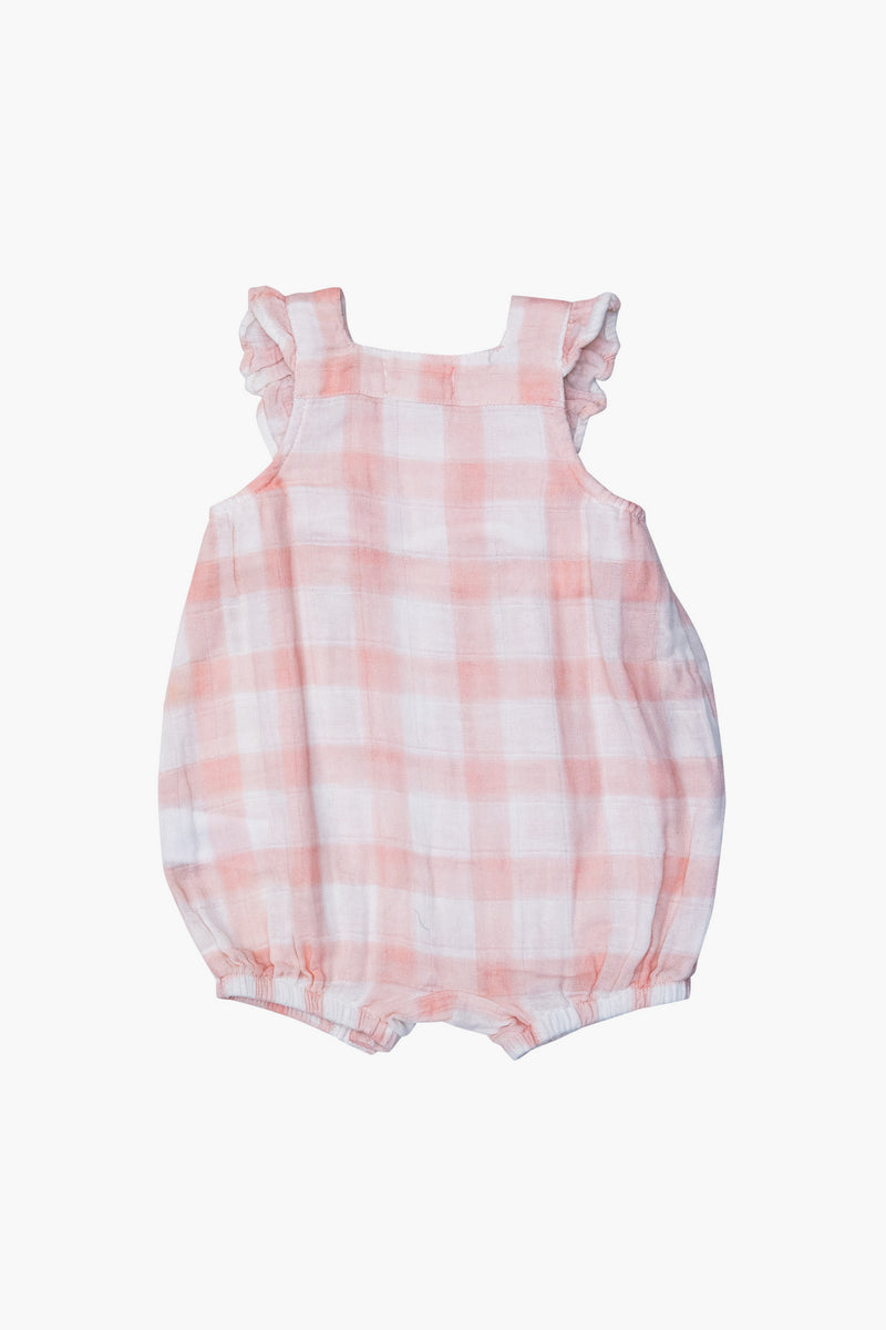 In the sweetest gingham print that will have your little one looking all kinds of adorable, the Pink Painted Overall Shortie features a square neckline, ruffled shoulders, and a smocked front. Snap closures at the neckline and between the legs help to make changing effortless, and an easy to care for organic cotton muslin fabric makes washing a breeze. We know you'll reach for this style over and over again when dressing your kiddo this season!