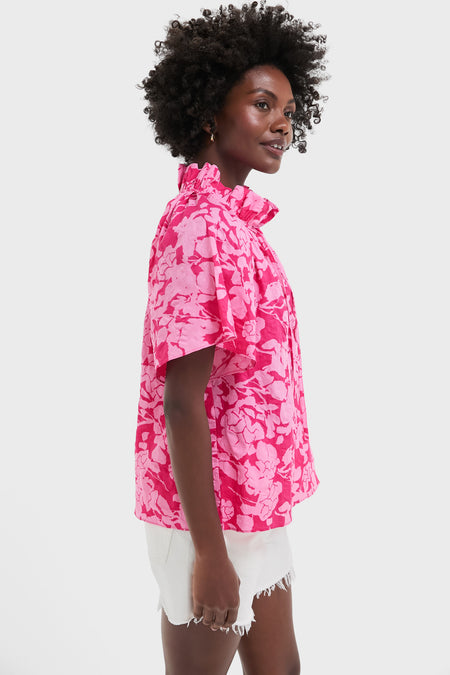 The Pink Textured Floral Thea Blouse is a feminine staple. With a relaxed fit, ruffle stand collar, neck-ties, and flare sleeve, this top has it all. Pair with white denim, sandals, and a raffia clutch for a polished, warm weather look!