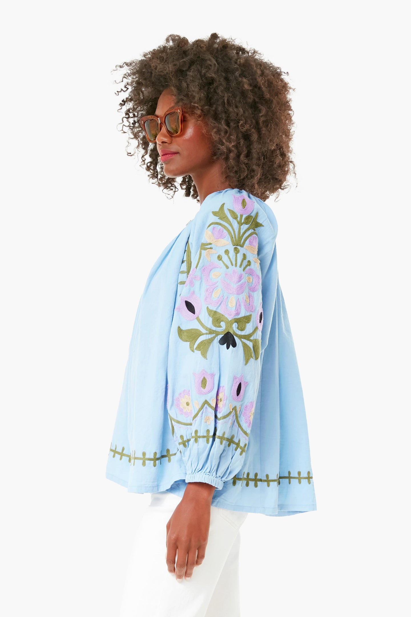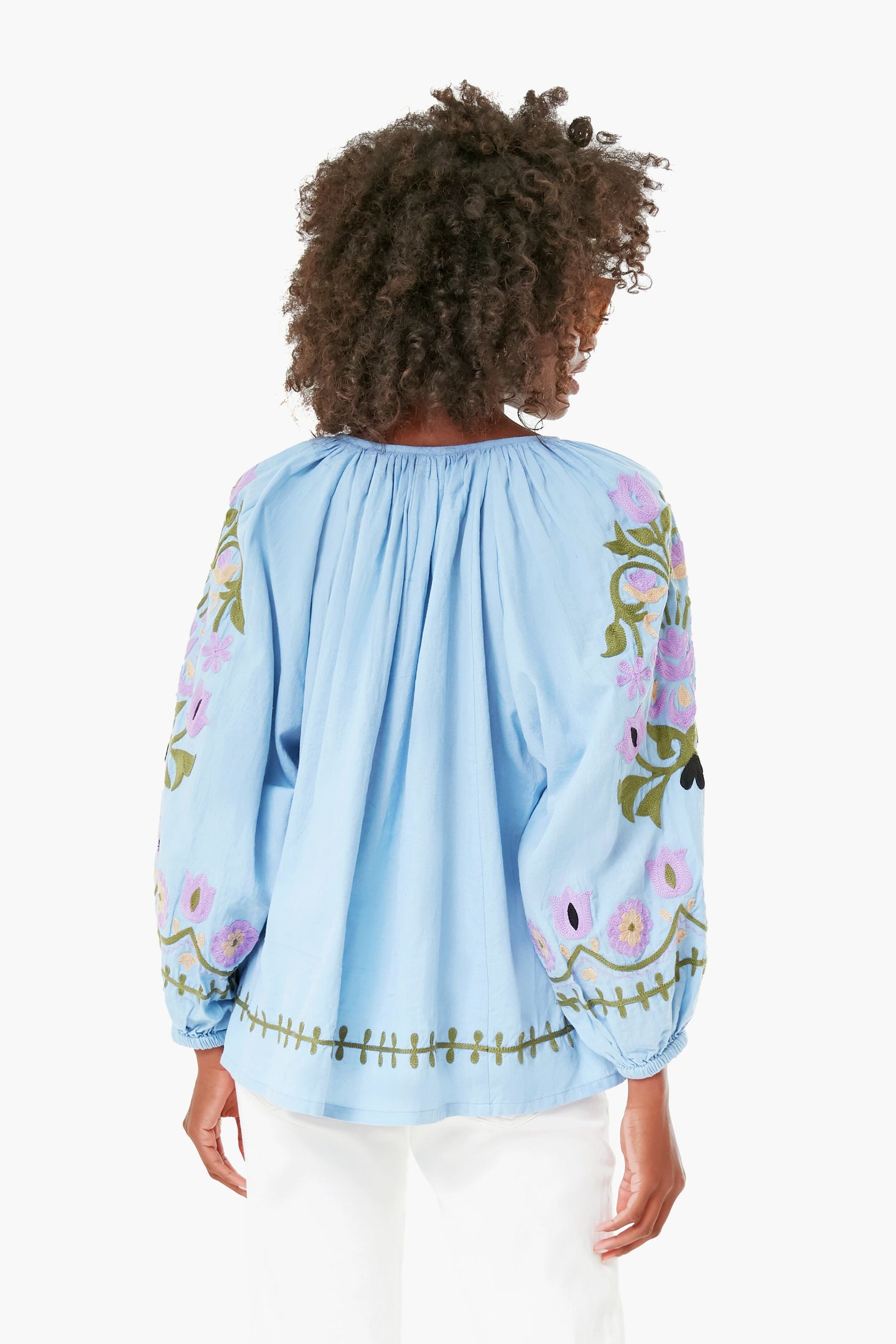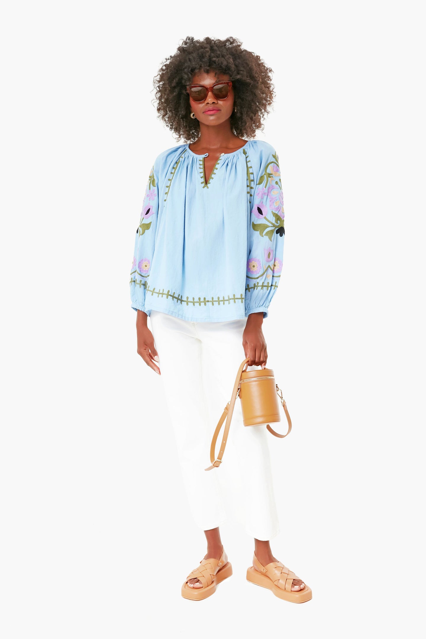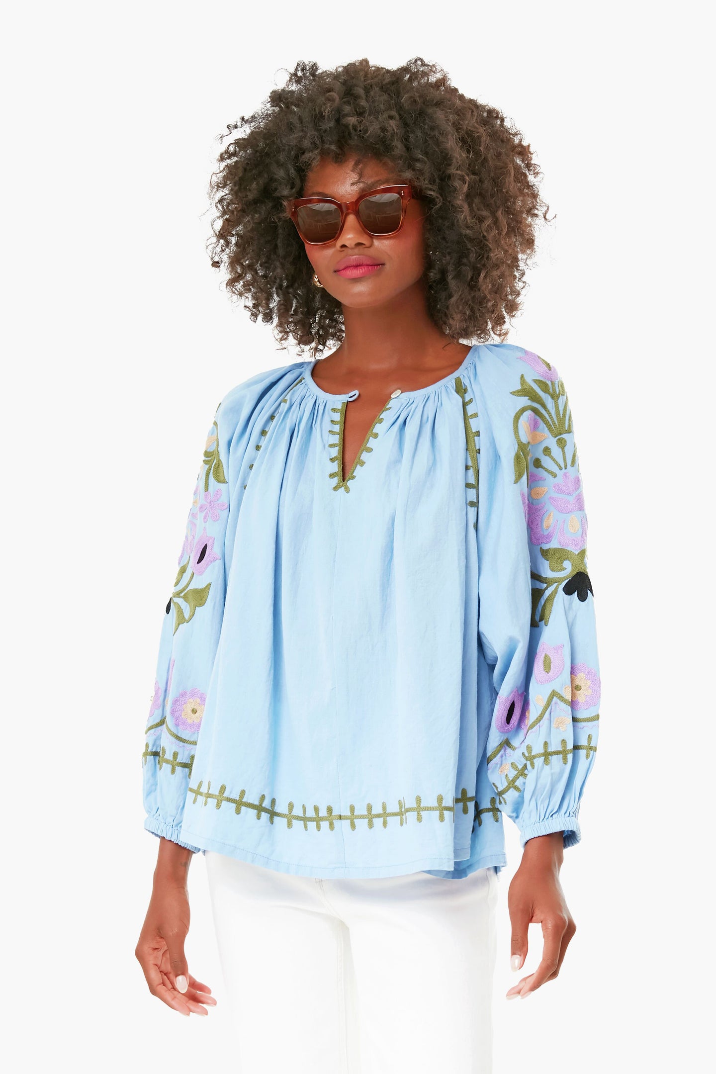 Dress up your casual ensembles this season with the Placid Blue Lavandou Anette Top. This blouse features puff sleeves and is made from airy cotton flax with a breezy fit. The embroidery is drawn in-house and placed differently on each so you get a one-of-a-kind statement piece. Pair with shorts or jeans for an effortless look!