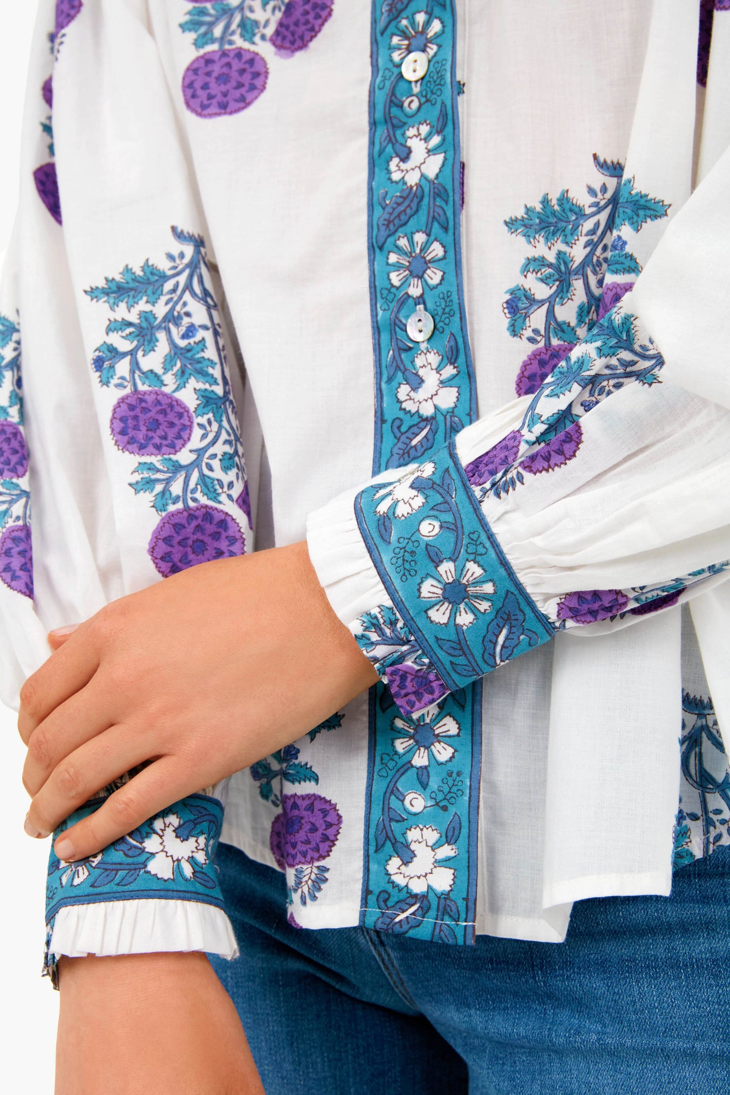 The Poet Lazuli Blouse is made from hand block-printed cotton in rich, saturated hues. This style features a ruffle neckline and voluminous sleeves with contrast printed cuffs and front placket. Add wide leg jeans for a 70s-inspired weekend look.