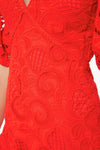 The Blanca Dress is an elegant mini cut from macrame lace in a bright poppy hue. Featuring a plunging v-neckline, scallop detail at the hem, and voluminous puff sleeves, this style is romantic and elevated. Add a clutch and heels for a flirty date night look!