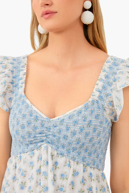 The Powder Blue Athalia Dress flaunts voluminous ruffled sleeves, a fit-and-flare silhouette, smocked bodice, and an asymmetrical hem. Made from a pink and blue ditsy floral print, this mini is a whimsical and lightweight addition to your warm-weather wardrobe. Pair with wedges and a wicker tote for a feminine look!