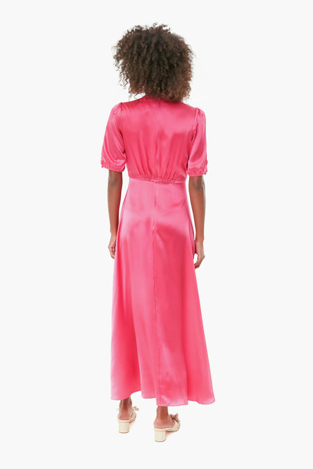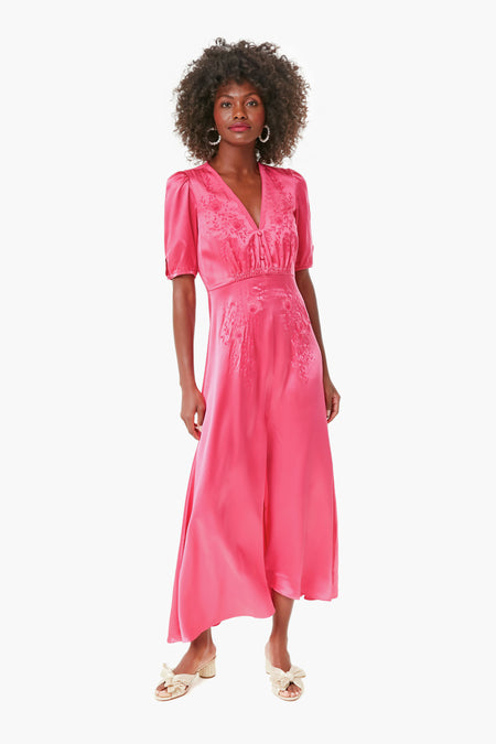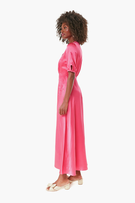 Cut to a flattering silhouette, the Punch Pink Flowering Lea Long Dress features a fitted waist and blouson bodice, with gently puffed sleeves and a fit-and-flare skirt for a feminine look. Covered buttons trace down the front of the dress to compliment the embroidered silk, creating the perfect occasion-ready frock. Pair with heels and pearl accessories for special celebrations.