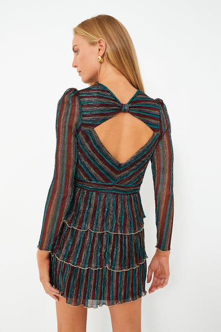 We are ready to party in the Zariah Dress! Beautifully crafted with rainbow striped pleating, this flirty mini is complete with puffed shoulders, a diamond cutout at the back, and a banded waist for a cinched, figure- flattering fit — but our favorite detail has to be that ruffle tiered skirt that delivers a swingy movement! Perfect for an evening event or a cocktail party, we are styling this piece with heels, glitzy earrings, and a handbag for a glamorous look.