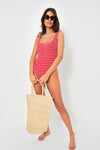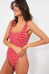 The Red and White One Piece features an updated angular square neckline and a scooped low back to show off some sun-kissed skin. With a thick shoulder strap width that provides comfort and support without subtracting style, this swimsuit hugs the body in all the right places thanks to the textured crinkle material, which stretches and retracts to give shape without losing it’s own.