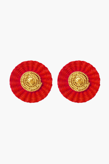 The Red Studs are handmade using iraca palm and 24k gold-plated bronze. The perfect size for an accent earring but won't weigh you down, these round colored discs are the perfect pop of color to add to any look. For when you need an outfit pick-me-up, pair these stunners with denim and a blouse for added fun.