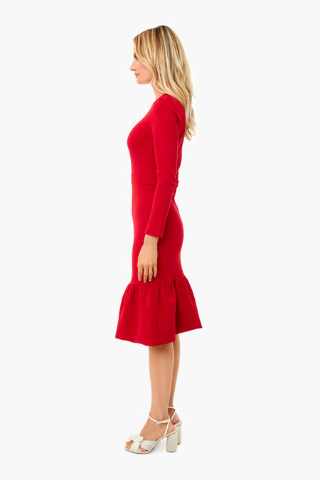 The Red Lena Dress embodies peak elegance. Made from thick ponte knit fabric, this sheath silhouette has three-quarter length sleeves, an exposed back zipper, and a tulle-filled peplum at the hem. Figure flattering, this is a must have for holiday parties this season!