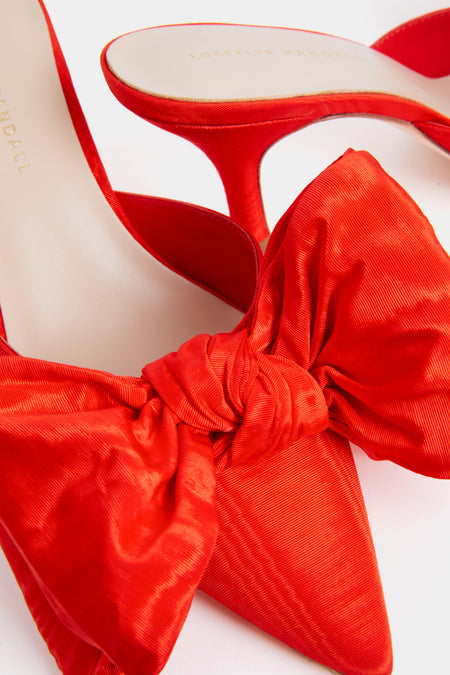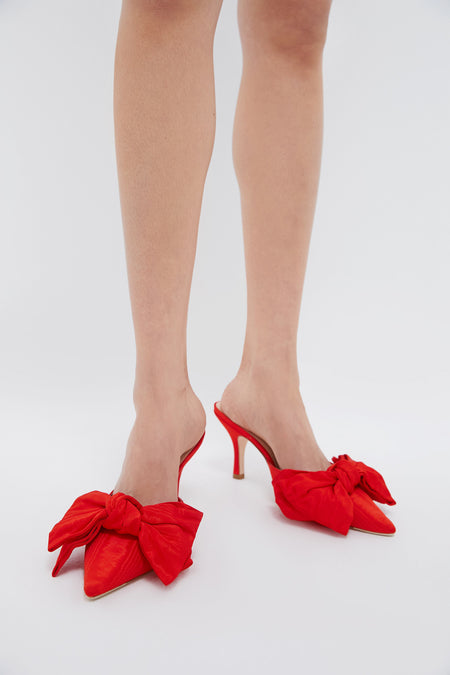 The Red Margot Bow Heels are the ideal shoe for everything from holiday dinners to cocktail parties. An easy mule silhouette that is upgraded with a dramatic bow detail and vibrant red color, these are eye-catching, classy, and fun! Pair with black trousers and a white button down or with a midi dress and gold hoops for a look that will collect compliments all night long!