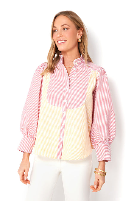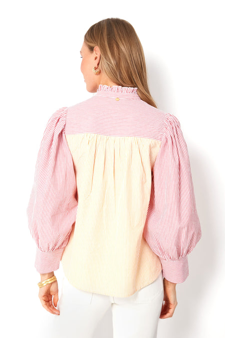 Your classic button down reinvented– meet the Red Polette Blouse. A feminine ruffle collar plays well with the slightly puffed sleeves and button front placket while the red and yellow colorblock stripes add a playful and fun feel. Pair with trousers and flats for a day in the office or play it cool and opt for your favorite denim for an it-girl weekend look.