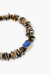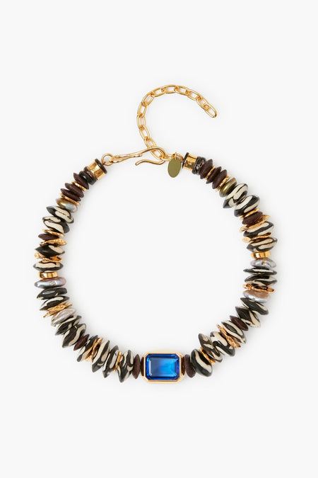 - Material: single-strand natural shell, batik bone, chocolate brown Ashanti, gray bronze freshwater pearl accents, royal blue faceted quartz baguette stone, and a gold-plated bead collar