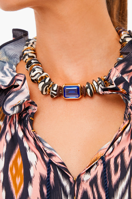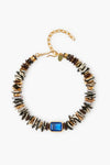 The Royal Goddess Collar Necklace is made from single-strand natural shell, batik bone, chocolate brown Ashanti, gray bronze freshwater pearl accents, a royal blue faceted quartz baguette stone, and a gold-plated bead collar. Bohemian and luxurious, we are pairing it with bold dresses and for a stand-out look!