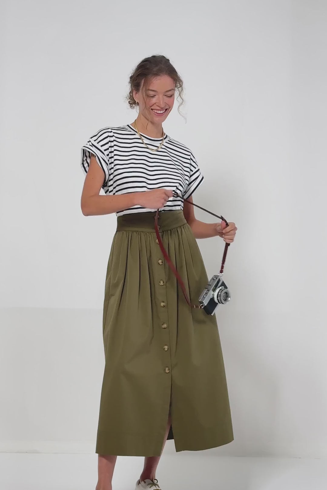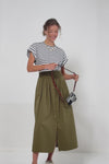 An elevated take on a style staple, the Safari Darja Midi Skirt is a style you can wear to events big and small. This midi boasts a fitted waist with a ruched body and front button closure. The army green color is perfect for wearing with neutrals or floral patterns. Pair with loafers and a button down for the office, or with an eyelet blouse and sandals for weekend brunch.