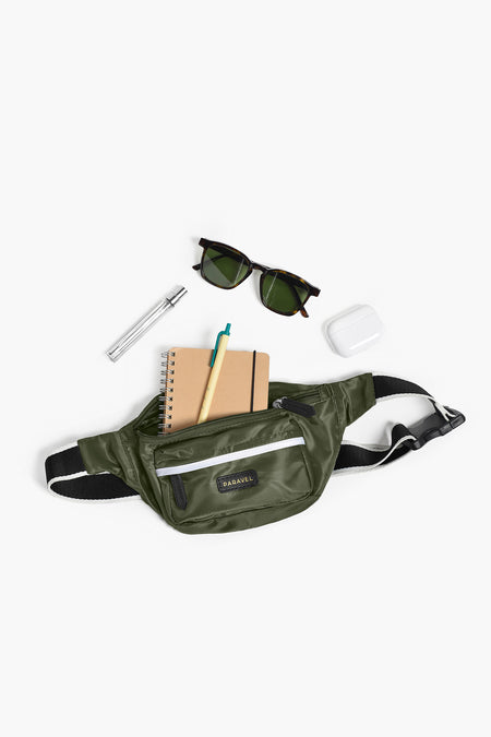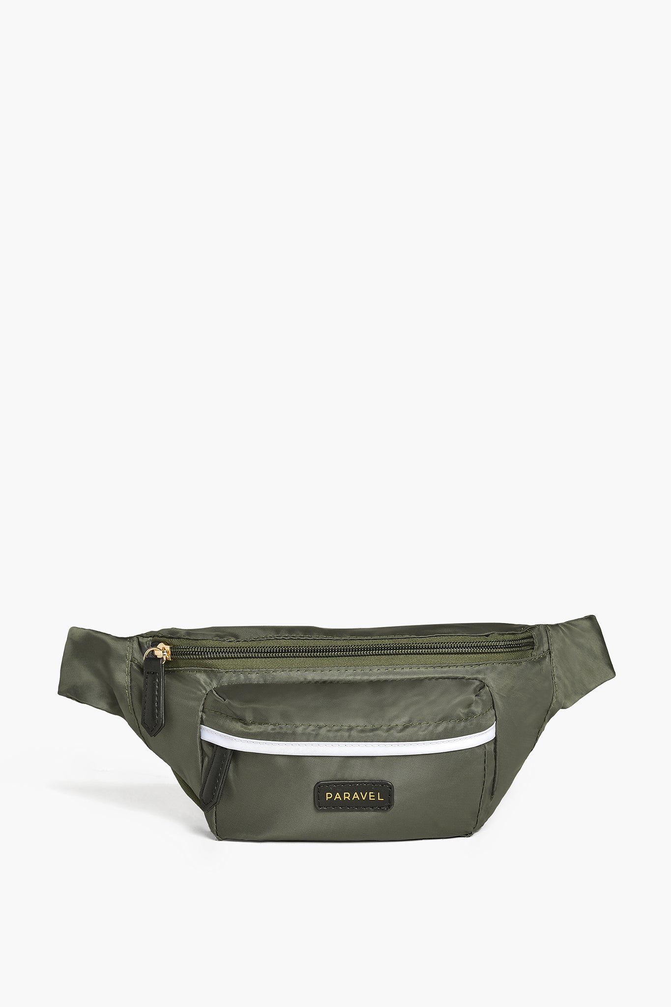 On the go and on trend, the Safari Green Fold Up Belt Bag has delightful details like striped webbing and two zip pockets for your essentials that make this belt bag a functional way to add brightness to your look. Once youâre packed and ready, use the adjustable buckle strap to wear the pack around the waist or across the body for hands-free adventures. When its work is done, fold it flat and zip it neatly into a wallet-sized pouch.