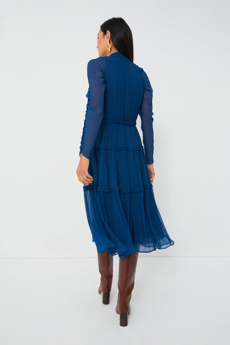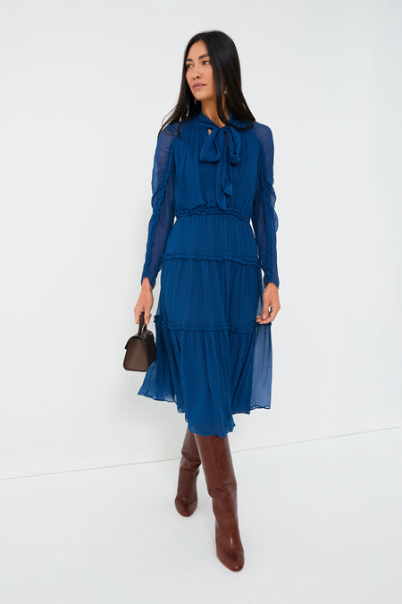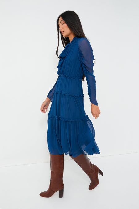 A stunning, jewel-toned beauty, the Sapphire Idalia Dress is exactly what we have been searching for. An elegant midi dress with plenty of feminine touches like the self-tie bow at the neckline, ruched sleeves, and ruffle trim at the skirt tiers, this sophisticated silhouette is earning a place in our closet this season. Dress it down with boots and a top handle bag for lunch dates and after-work drinks, or elevate it with ease by adding heels and statement earrings for evening occasions.