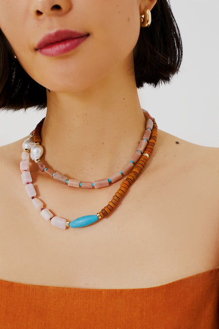 We're positively tickled pink by the color-blocked Cabana Necklace in sweet updated shades. This chic style has beads in honey brown recycled glass, peach moonstone, Peruvian pink opal, turquoise, and faceted ruby, with freshwater pearl accents. Wear long with espadrilles and a printed maxi, or double it up with a relaxed tee and denim.