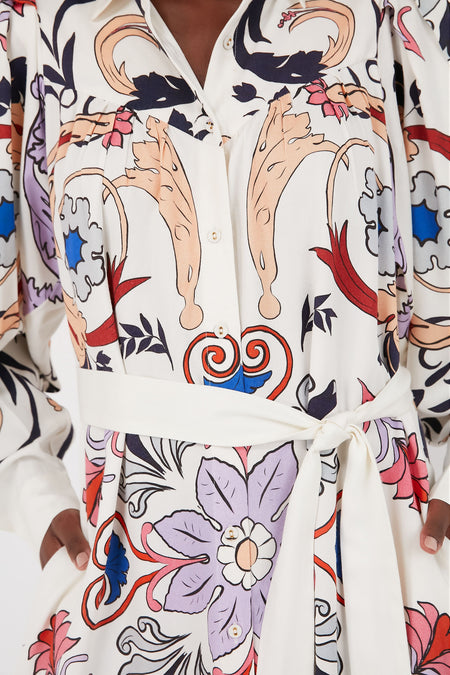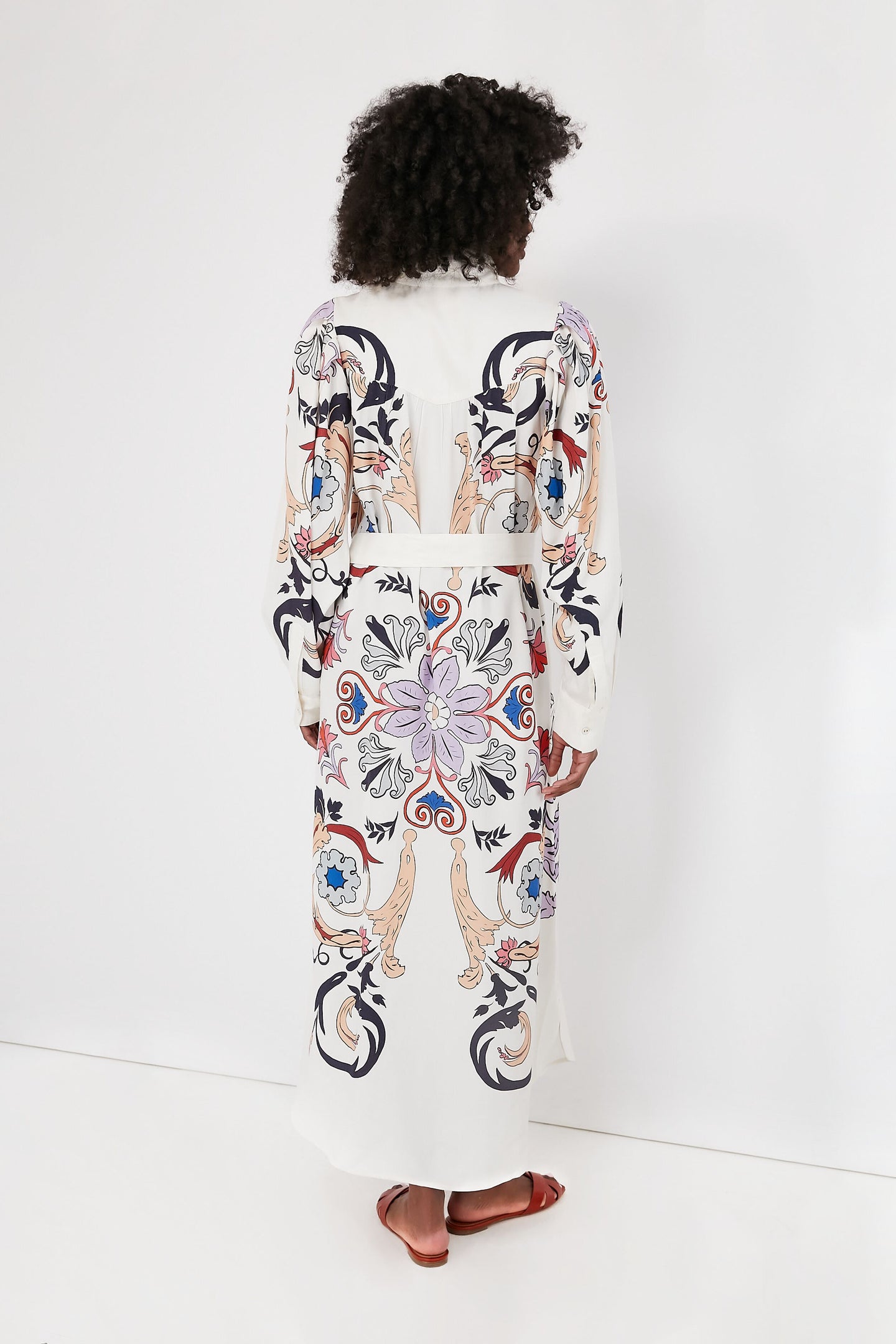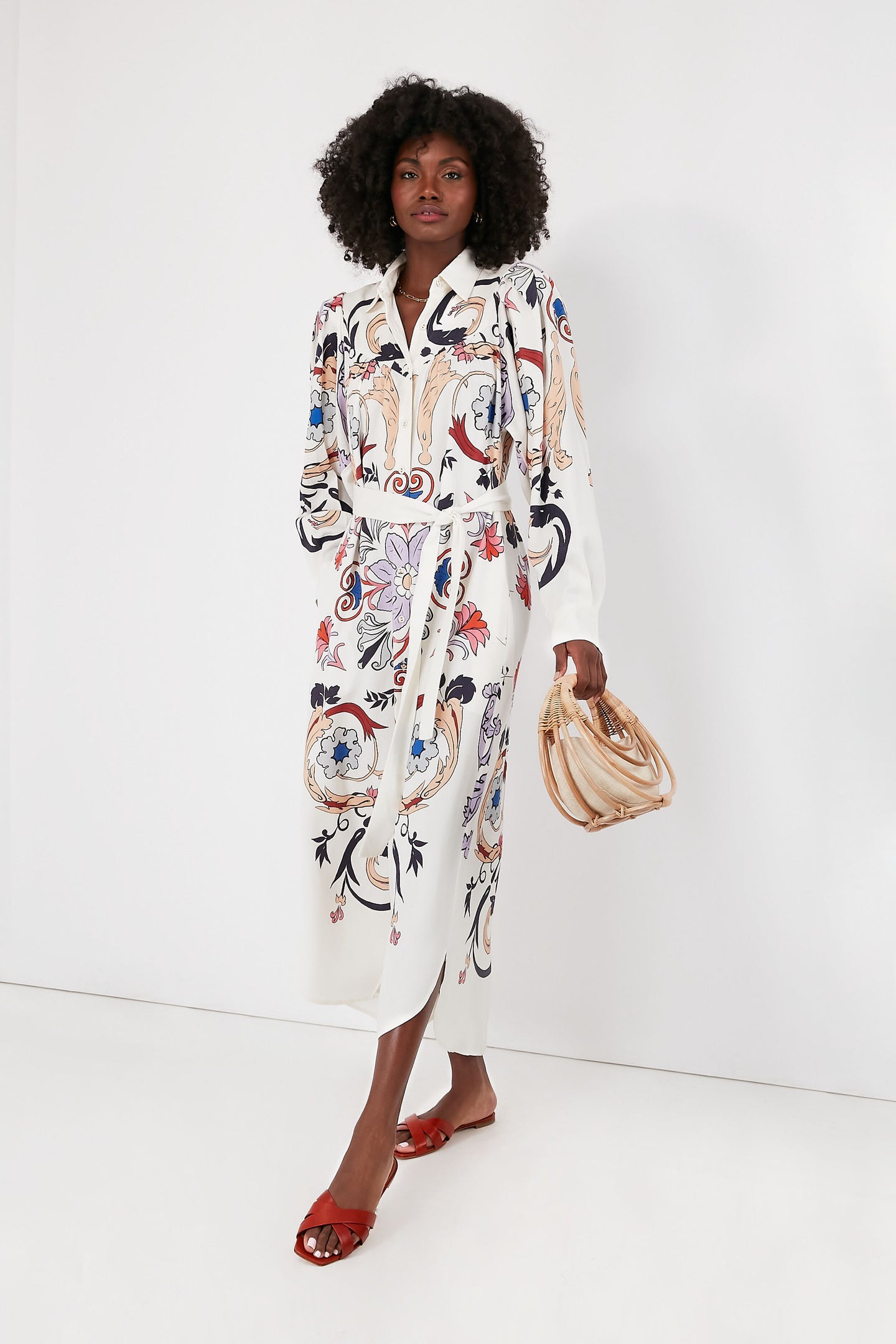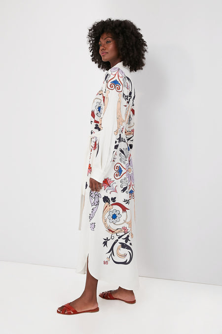 Drumroll please... we'd like to introduce you to the Scrolls Multi Gard Luna Dress. This maxi features the classic details of a shirtdress, like a spread collar, cuffed sleeves, and button front placket, plus feminine additions like an adjustable waist sash and intricate floral motifs. Dress it up for date night with heels and gold accessories or opt for flats and sunnies as you head into the office.