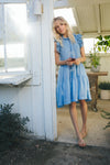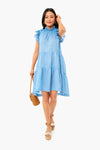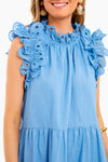The Sky Lee Embroidery Tunic features a relaxed silhouette with a high ruffle neckline, pleated details, and flutter sleeves. Made from a lightweight blue linen-cotton blend, this style is feminine and effortless. Pair with raffia accessories and sandals for brunch with friends!