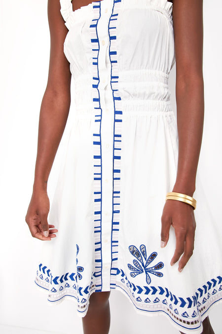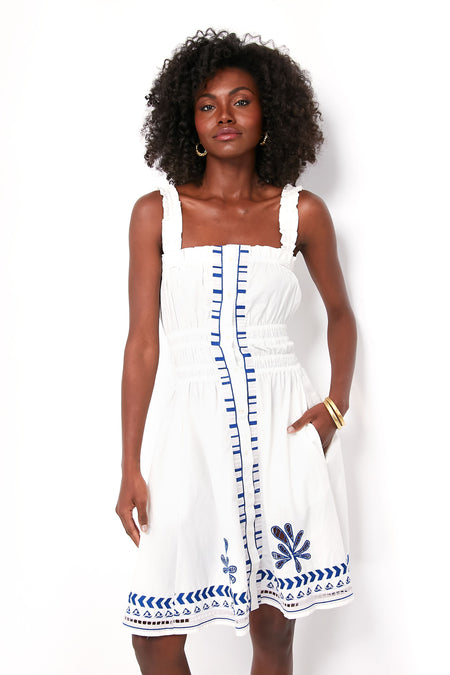 The Soumy White Jimmy Embroidered Dress is our perfect summer silhouette. Shirred all the way through and traced with elastic trims for a comfortable fit, we love the ruffled shoulder straps and mother of pearl buttons all down the front. Chic and easy to wear, this mini does well with heeled sandals and sunnies for pretty much any warm-weather occasion: park picnics, breezy boat rides, and sunny celebrations, you name it!