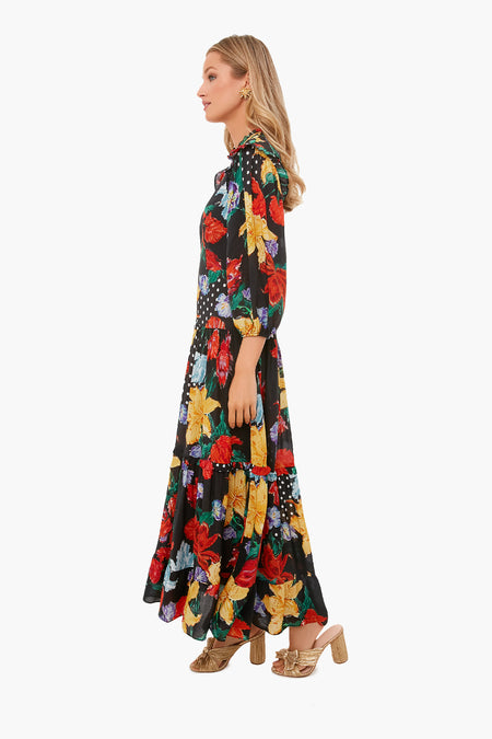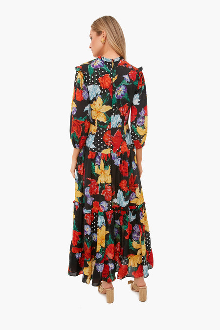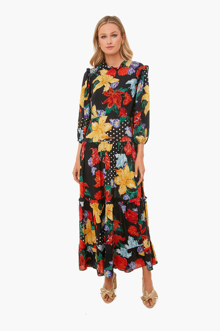 The Spotted Lily Garden Monet Dress features ruffle accents at the shoulders, neckline, and skirt. Made from bold printed viscose, this midi is trendy and unique. Flowy and glamorous, this style can be dressed up with gold accessories for holiday parties.