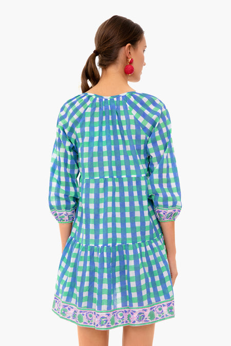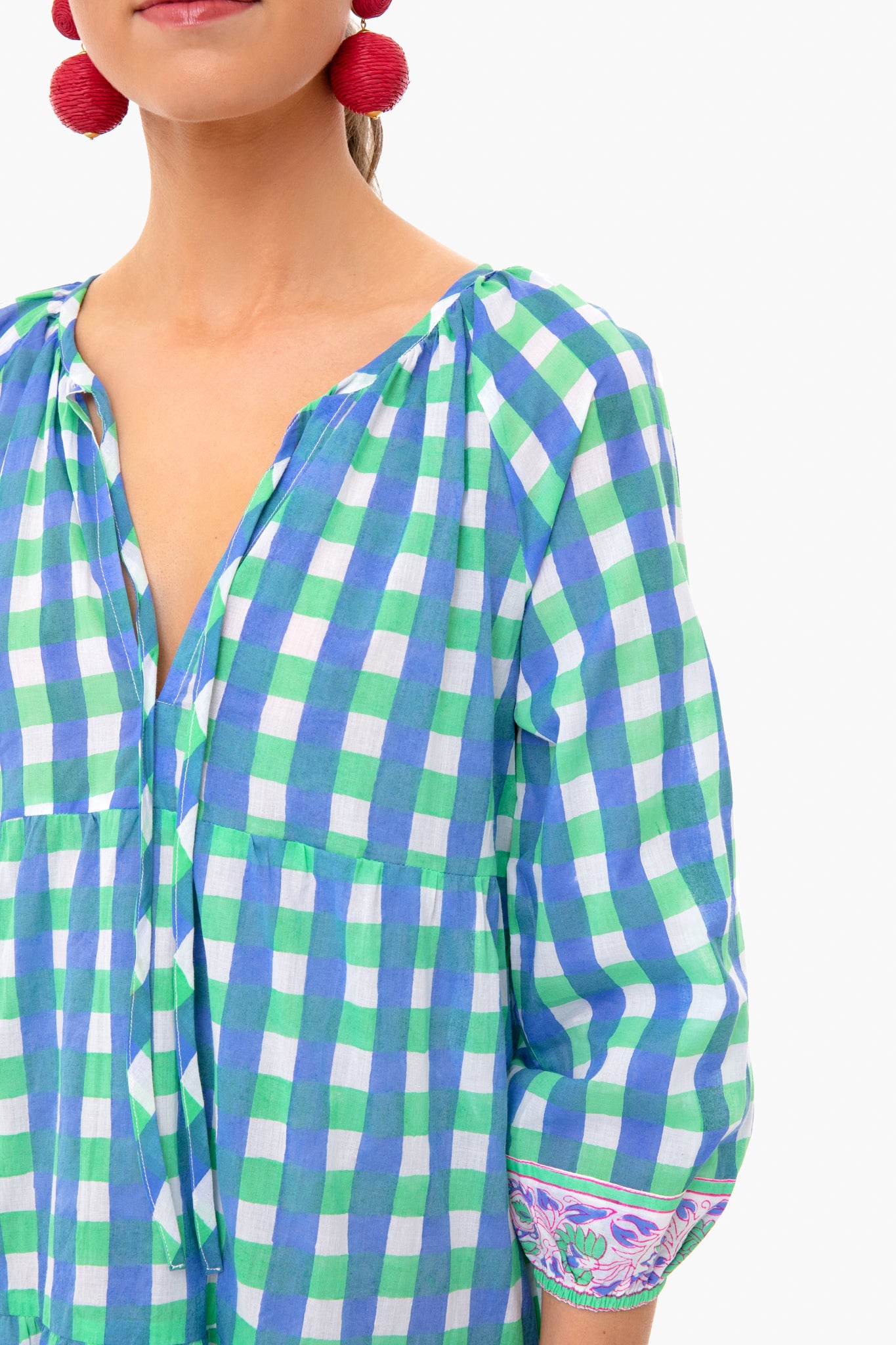 With a loose, A-line fit, elasticated bracelet sleeves, and knee-length silhouette, the Stem Green and Cornflower Blue Gingham Priya Dress features a breezy fit and island feel. Comfortable and chic, you’ll want to wear this caftan for days by the sea and nights with a refreshing cocktail in hand.