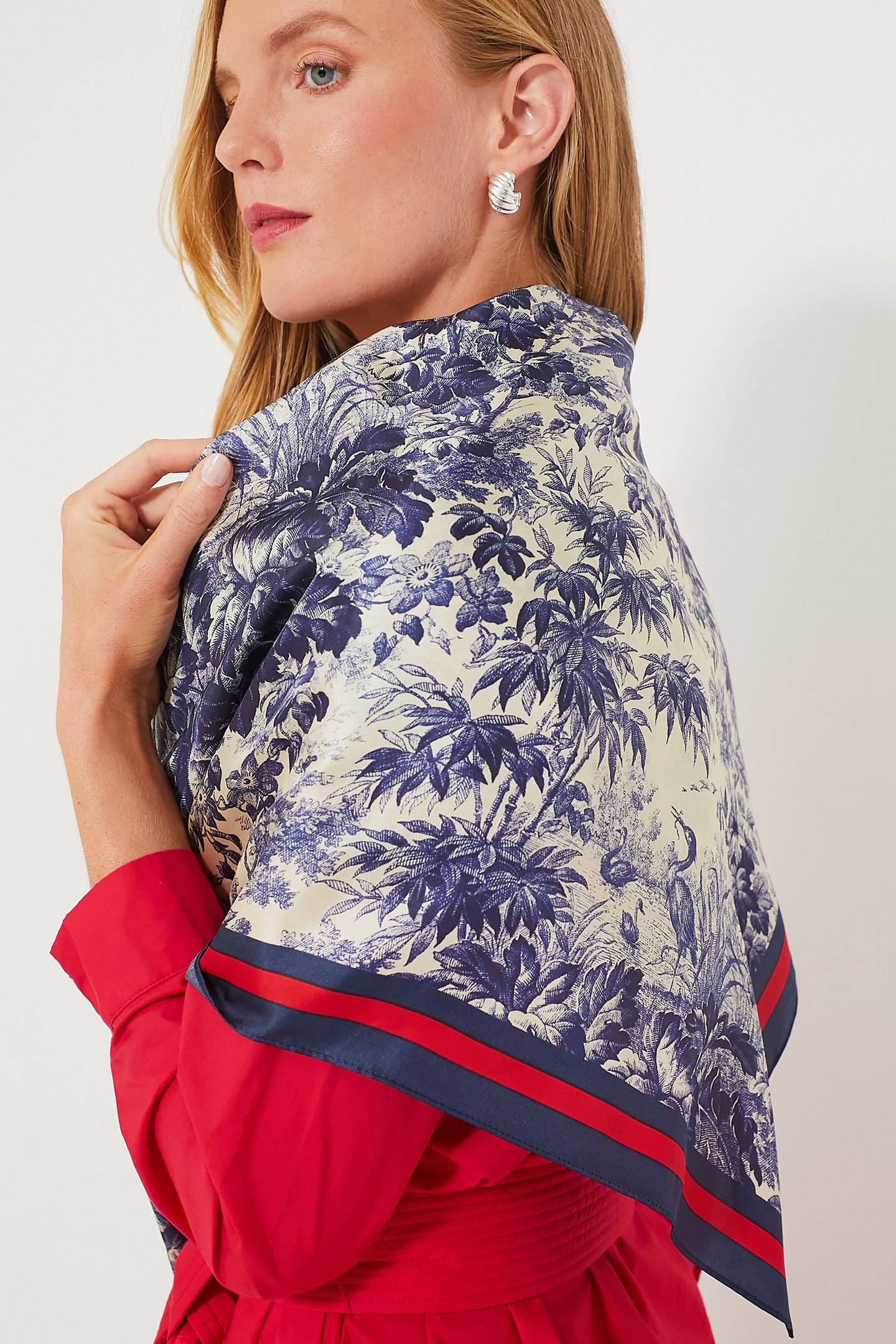 Striking a balance between our mini scarves and our larger ones, the Stonewash Cypress Toile Medium Silk Scarf is the perfect go-to when you need a pop of color. Versatile enough to be tied around the neck or worn over the shoulders like a shawl, this stunning style is adorned with one of our custom prints for a special touch. Spice up a neutral look with this darling number, make it a bold addition by pairing with brights, or gift one to a friend if you're feeling extra nice!