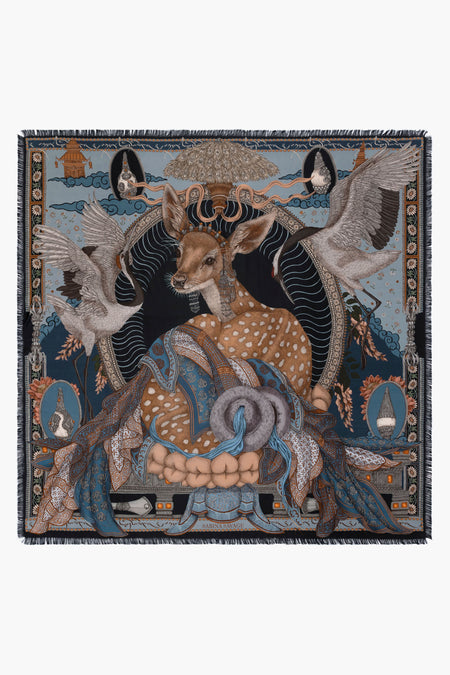 The breathtaking color and luxe silk composition of the Storm Steel Large Scarf make it a must-have accessory. Featuring a peaceful deer motif in the center, as well as a lovely cool-toned palette with a calming effect, this piece represents symbols of serenity, harmony, and peace. Tie it around your neck or on a tote bag, or wear it over the shoulders like a shawl — it's endlessly chic and elegant no matter how you style it!