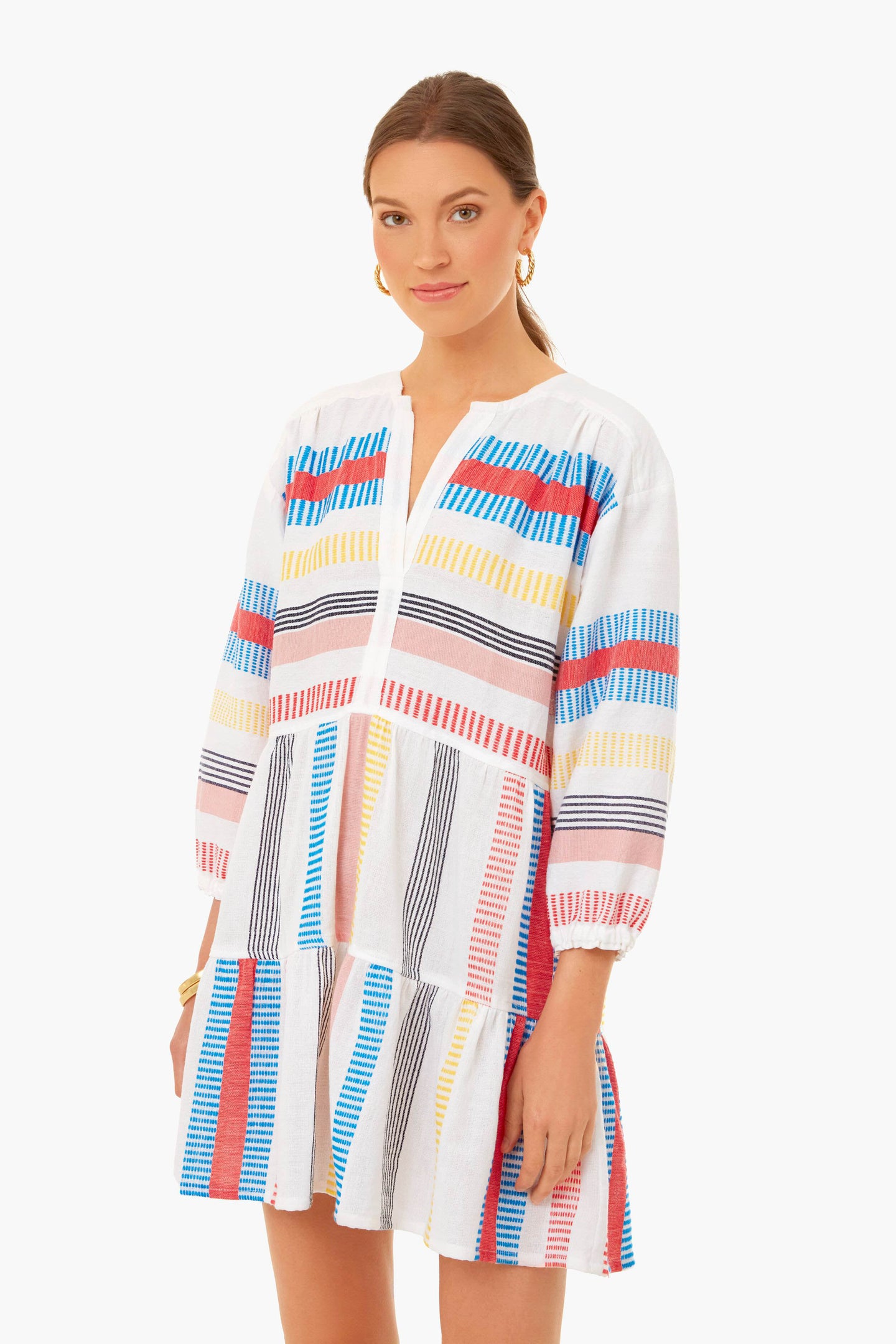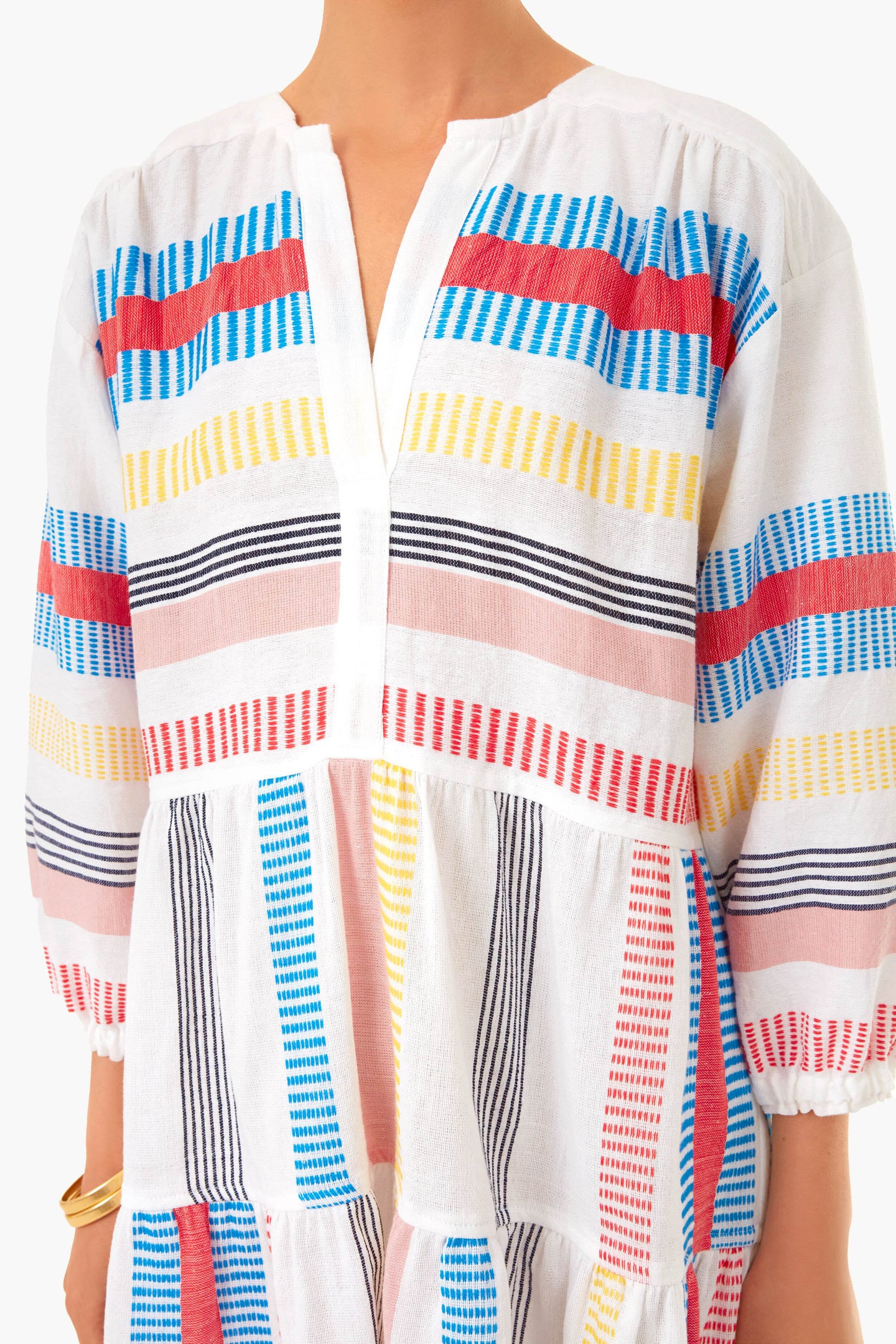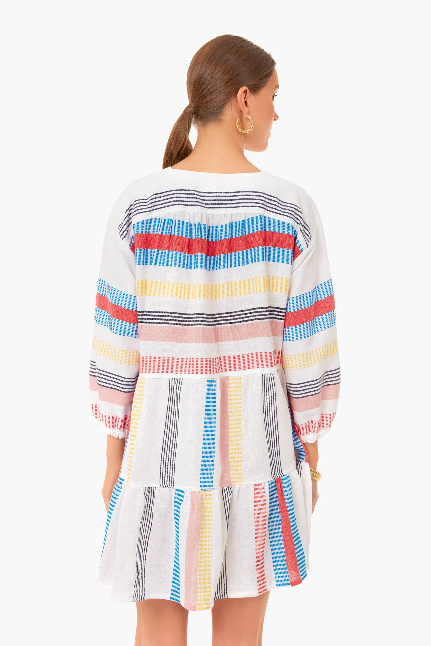 Quickly slip on the Stripe Fiesta Meseret Popover Dress for an easy outfit when you're on the go. This lightweight silhouette features an open V-neckline with three quarter puff sleeves and a tiered ruffled hem for a flouncy look. Hand woven in a super-soft cotton, this makes a great sundress or caftan no matter where the day takes you. Add a sunhat and sandals for a coffee run, then pair with a tote and gold jewelry for happy hour.