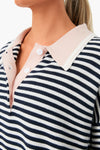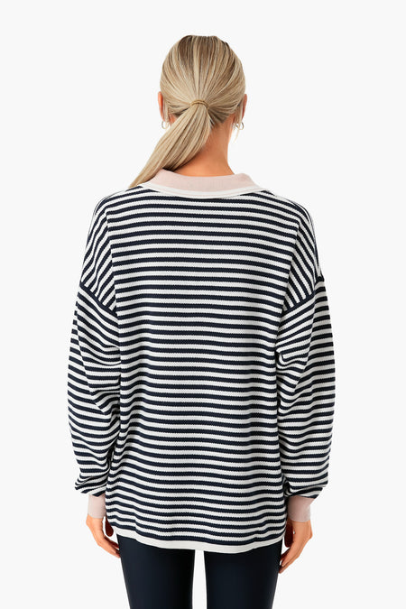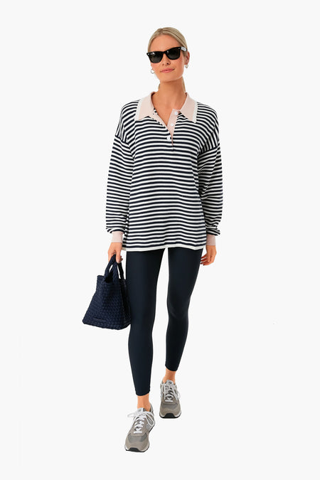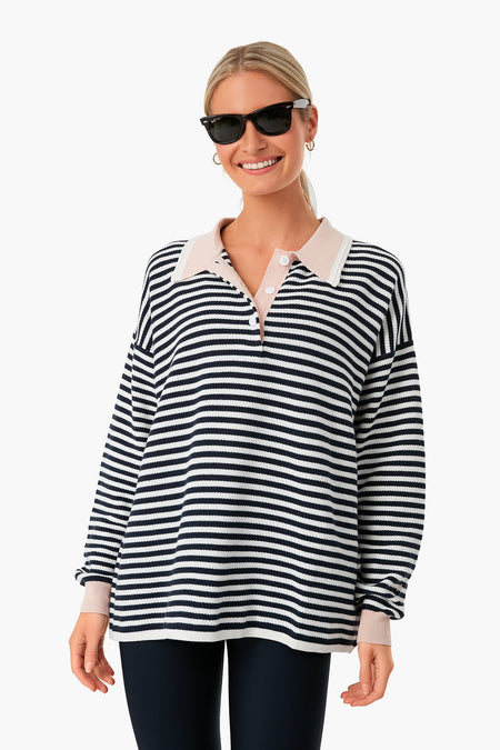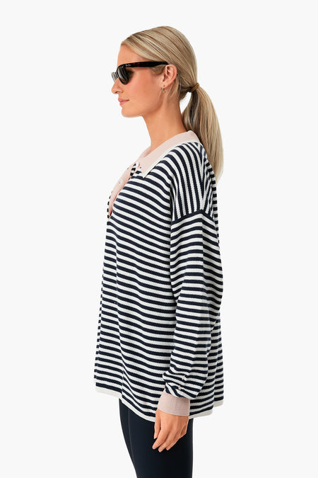 Slip on the Striped Norfolk Wonder Polo for a dose of old school Americana. This organic cotton knit number features a quarter-length button front placket with contrast trim on the neckline and cuffs in a relaxed silhouette. This top is meant for easygoing strolls around town with your favorite coffee in hand so pair it with leggings or joggers and donât forget sunglasses.