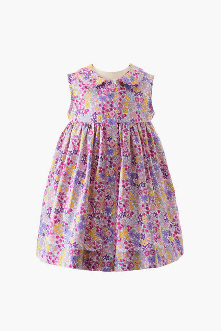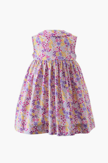 The Summer Floral Button-Front Dress and Bloomers features a floral print in bright and cheerful colors. This is a classic button-front sleeveless day dress with a sweet peter pan collar and gathers at the waist. Finished with matching ric rac trim, this style is sure to become your little one’s favorite!