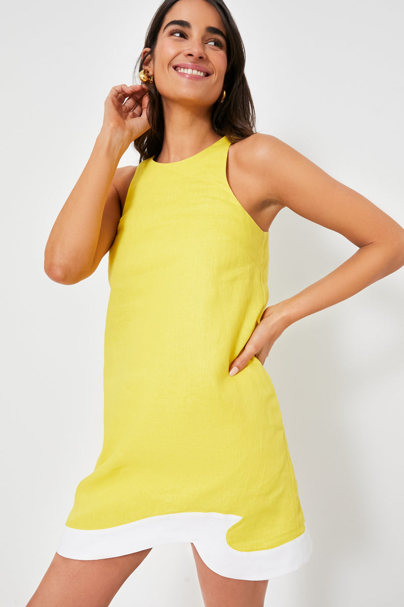 You will be a ray of sunshine in the Sunrise Allori Dress by STAUD. A sleeveless shift mini with a wave-design hem and vibrant yellow color, this style is the epitome of "joie de vivre". Pair with sandals and sunnies for a day strolling around town, or with espadrilles and statement earrings for brunch with the girls.