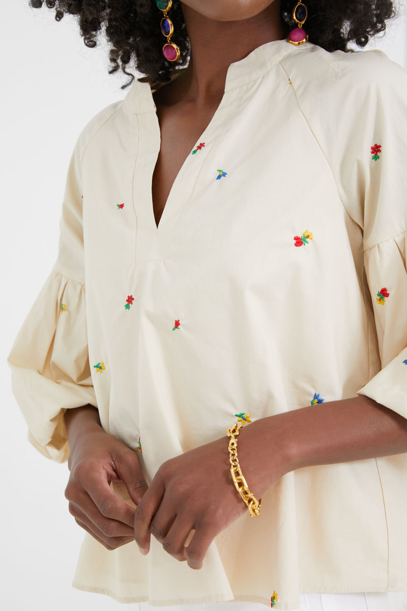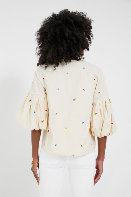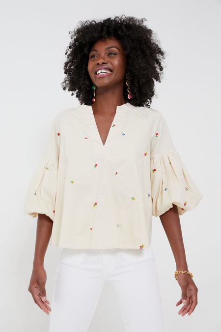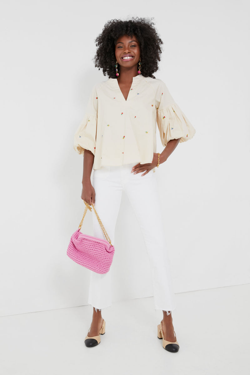 Featuring unique puff bell sleeves and delicate floral embroidery, the Blooms Blouse will be a perfect addition to your wardrobe this season. We're wearing this crisp cotton top with white denim and a colorful bag for an elevated daytime ensemble. Or pair with cutoffs and flat sandals for a chic yet casual daytime look. Either way, the ways to style this embroidered beauty are endless!