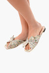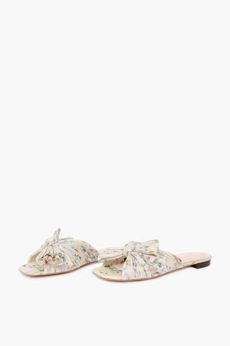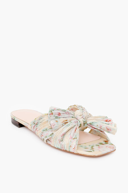 The Tan Daphne Knot Flat Sandal features a pleated knot flat in a fun floral print. With a padded foot bed, gold stamped logo, open toe and slight heel, this is the perfect combination of chic and practical.