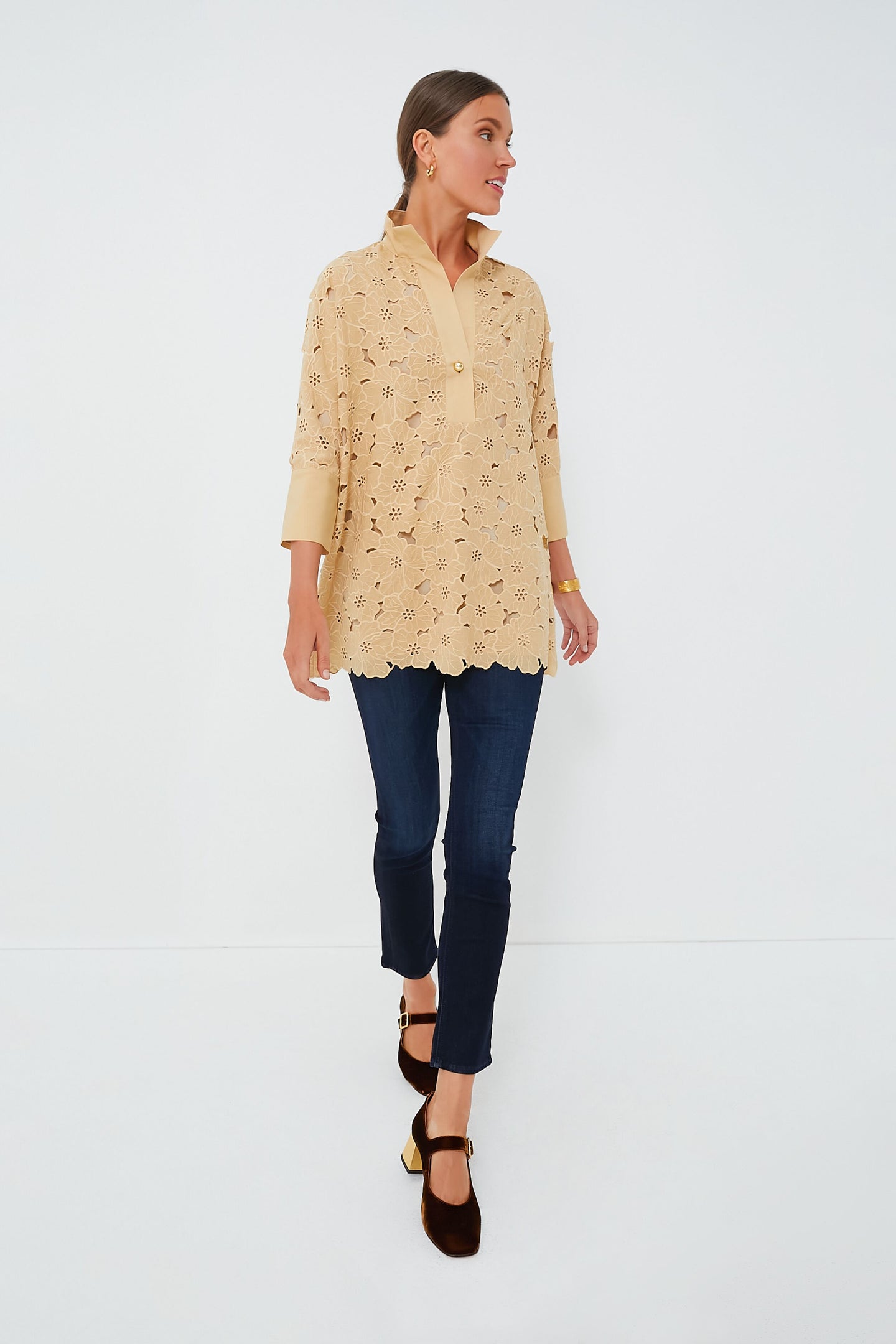 Our favorite desk-to-drinks blouse is back in a sophisticated, classic tan lace to add a dash of sass to your wardrobe. This top has the perfect stand collar and structured faux french cuffs to create a tailored piece that can be worn with effortless ease. Complete with a boxy but not oversized fit and a high-low hemline that is perfect for front tucking, this pullover can be styled with everything from denim to leather, four seasons a year!