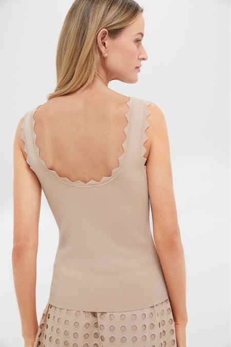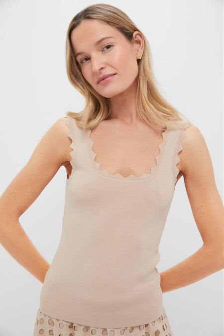 This tan tank may be an essential wardrobe staple, but it's anything but boring. Detailed with triangle ricrac trim at the neckline and shoulder straps, and made from a compression knit fabric that effortlessly flatters, this silhouette pairs well with just about anything. We are wearing it all the time, including under a blazer in the office, with wide leg denim for a retro date night look, or with a flowy maxi skirt when it's hot out!