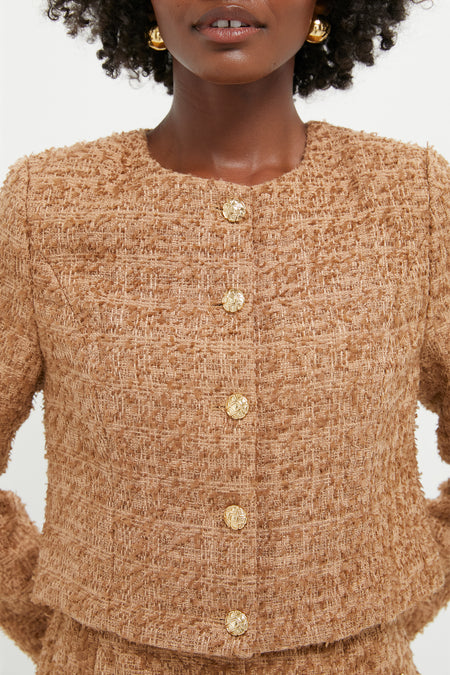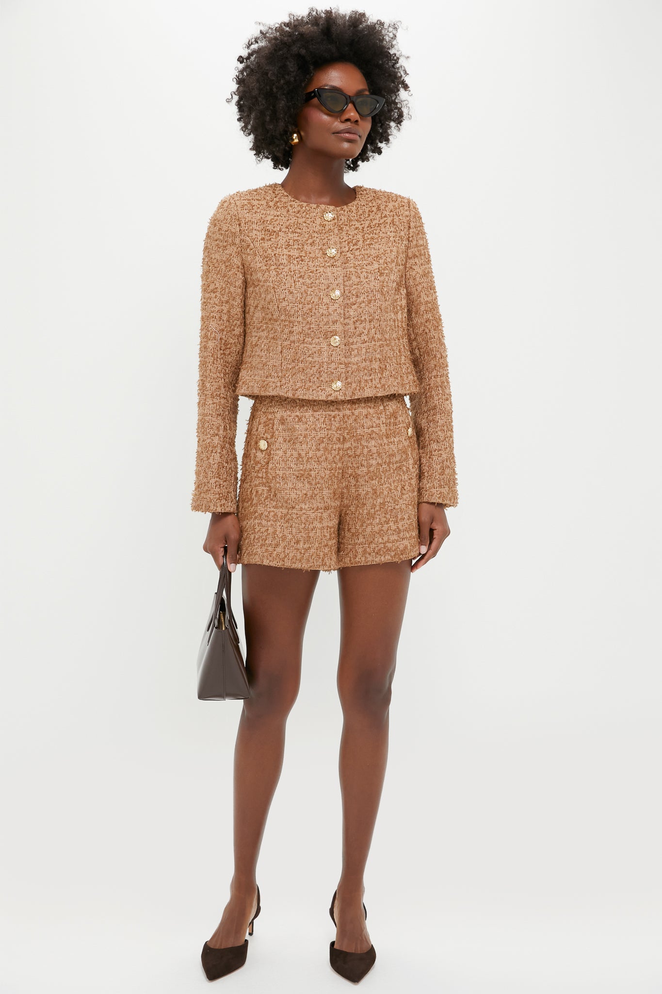 This elevated jacket is a flattering cropped style with a front button placket and boxy silhouette. Pair with the matching Tan Tweed Knox Shorts and boots or with wide leg denim and heels.
