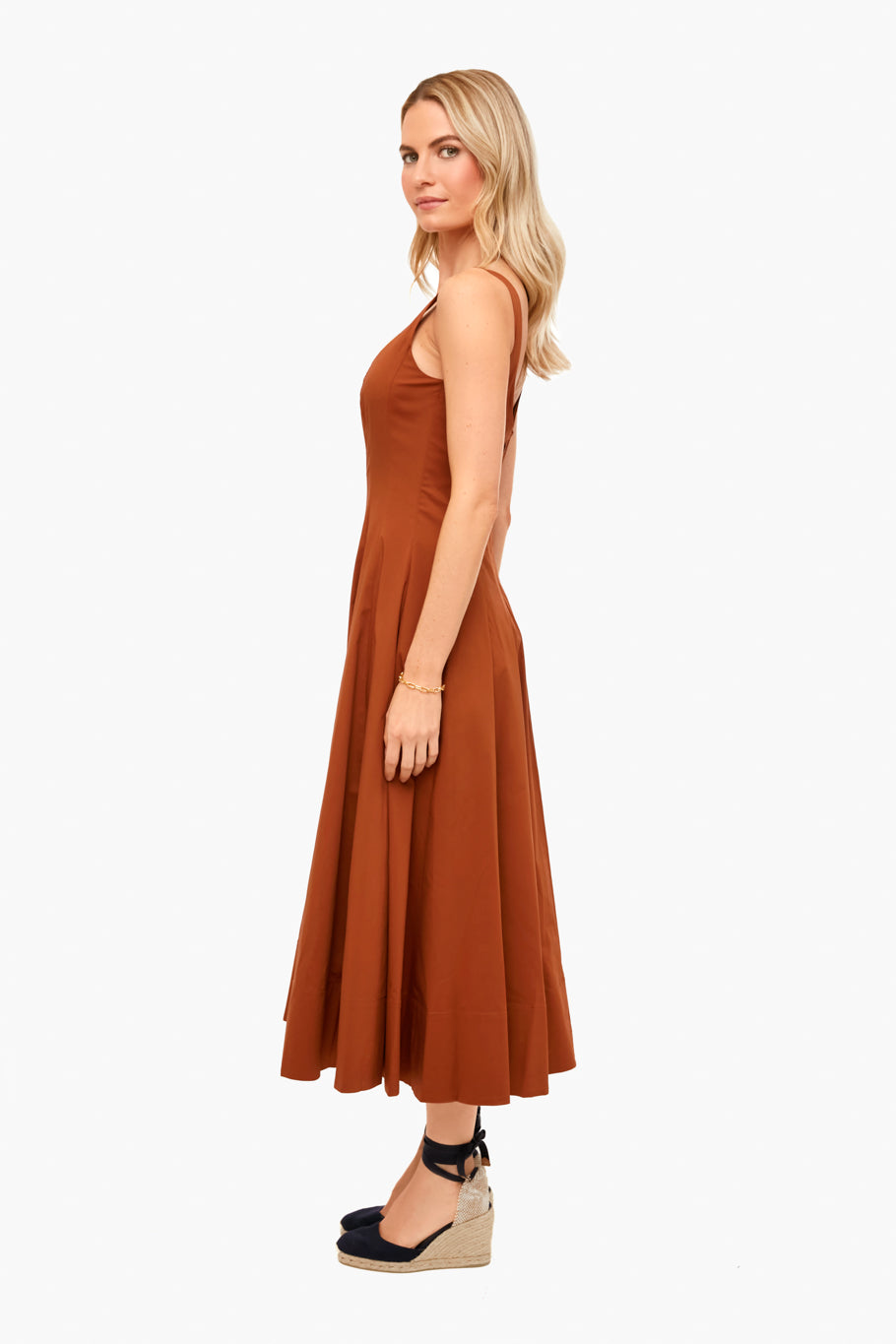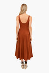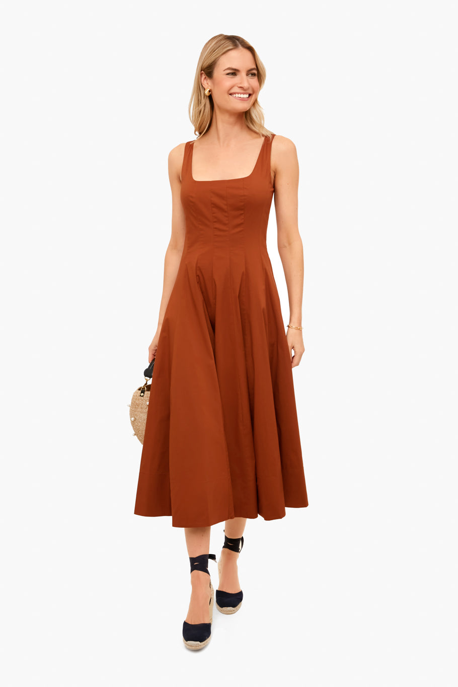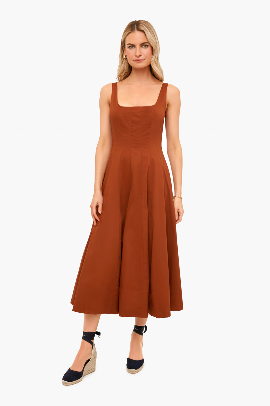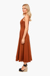 The Tan Wells Dress is elegant and sophisticated. A corset-style panel bodice creates a flattering, fitted shape through the waist and a full skirt. Made from lightweight cotton, this style pairs easily with statement earrings and heels for special occasions.