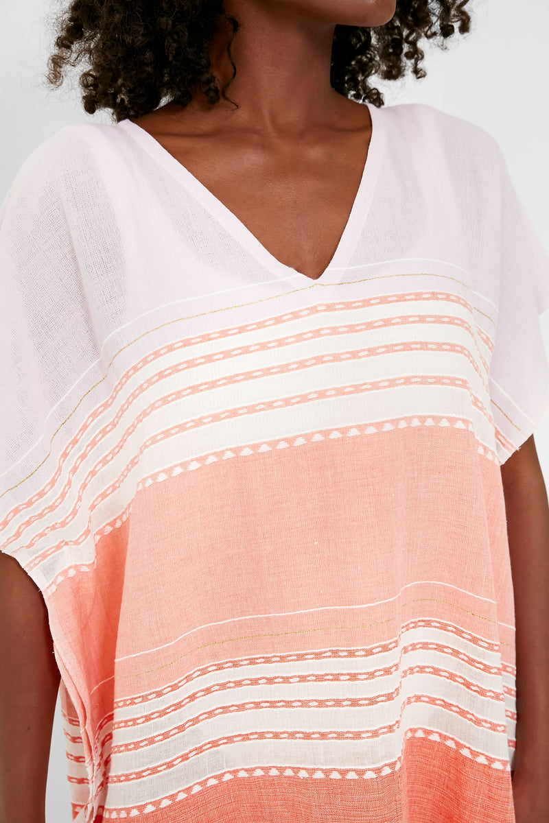 With a gradient of stripes made to evoke sunrise and sunset, the Tangerine Eshal Classic Caftan is the easy breezy number you've been searching for. Simple yet stylish details including a V-neckline, cap sleeves, and a fringed hem make this midi the life of the party for beach days, seaside happy hours, and poolside hangouts. Handwoven from Ethiopian tibeb cloth for a lightweight and airy composition, this is a wardrobe winner for sure!