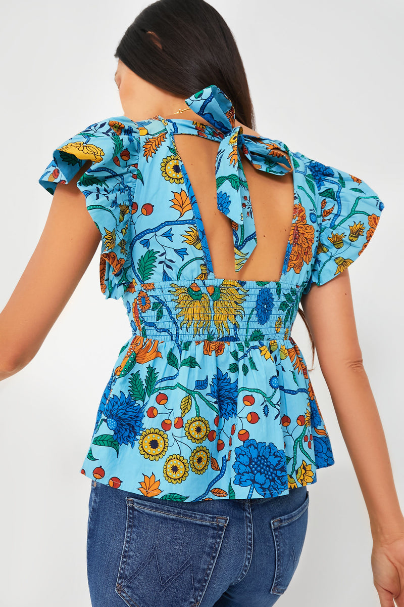 Bold and bright, the Tanika Print Mona Top boasts vibrant florals that are sure to add some color any outfit. Featuring a plunging V-neckline, short ruffle sleeves, and an open back with a tie detail, this piece demands attention! Perfect for vacations and backyard barbecues, we are styling this fun silhouette with white pants and raffia sandals for outdoor celebrations, or with a dark denim skirt and flats to transition it into cool weather.