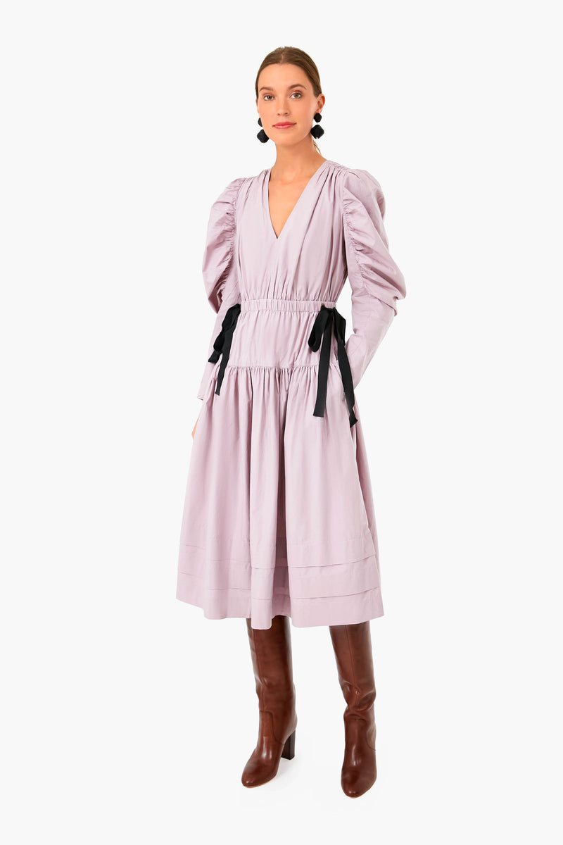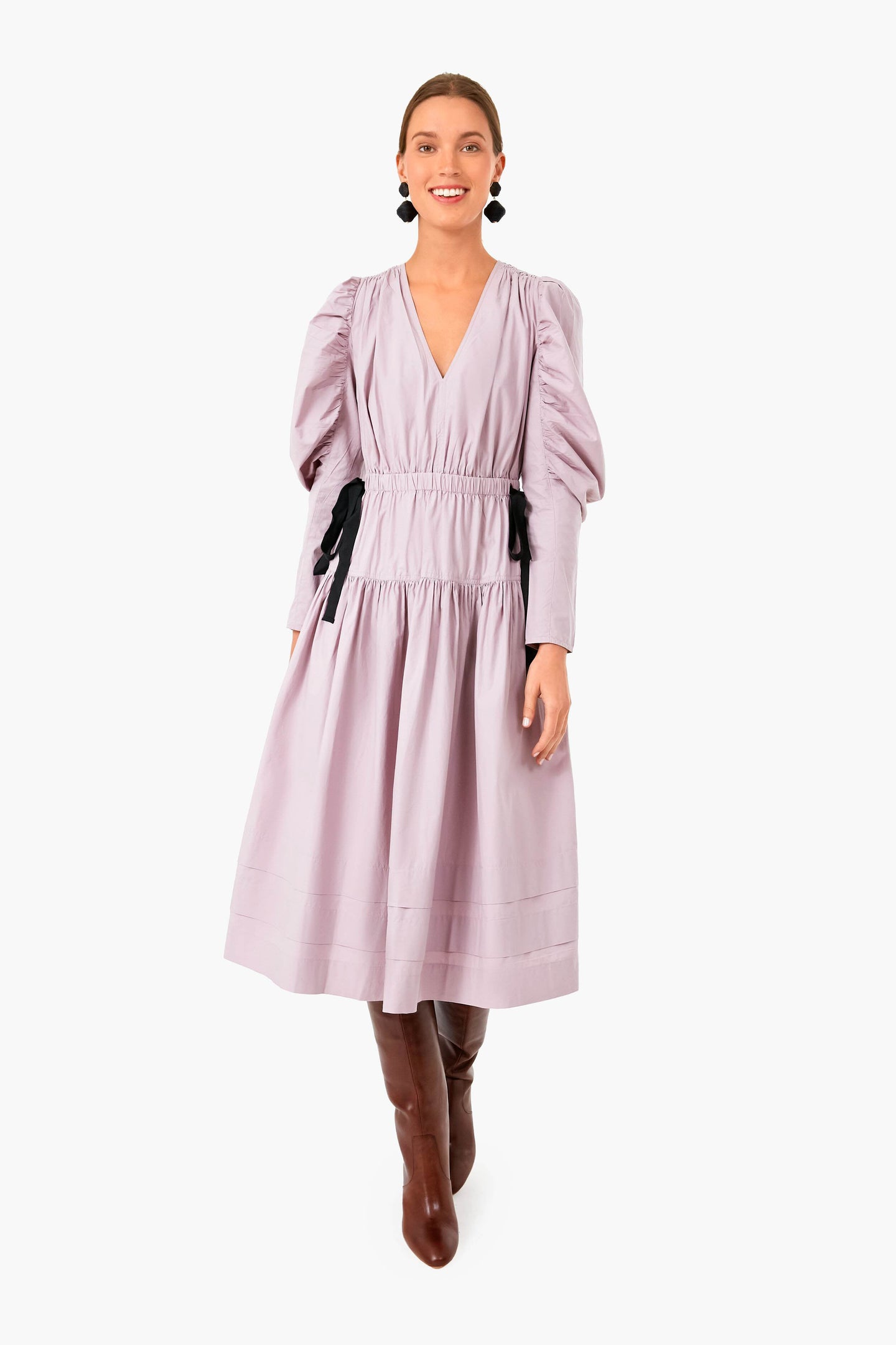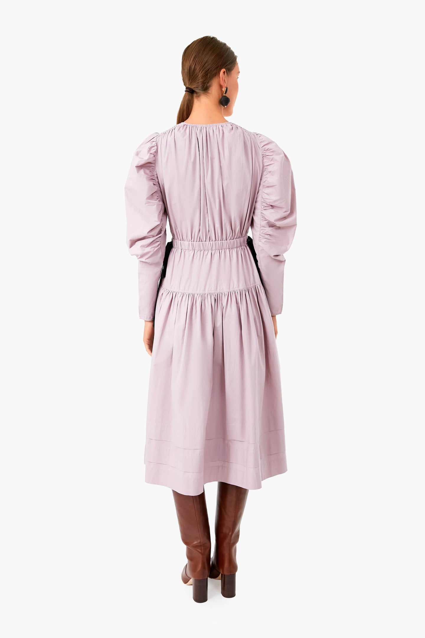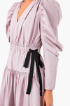 A signature Ulla Johnson silhouette, the Tanzanite Althea Dress is designed with a flattering split neckline and an elastic waist with grosgrain ties at each side. Featuring full, draped sleeves with delicate accent puffs stemming from each shoulder, this dramatic piece is sure to receive compliments. Add a pair of boots and statement earrings to this midi-length frock for the perfect autumn look.