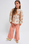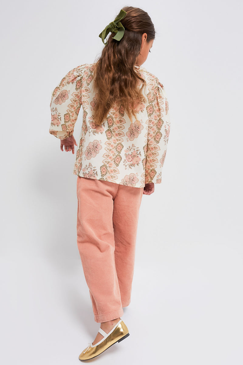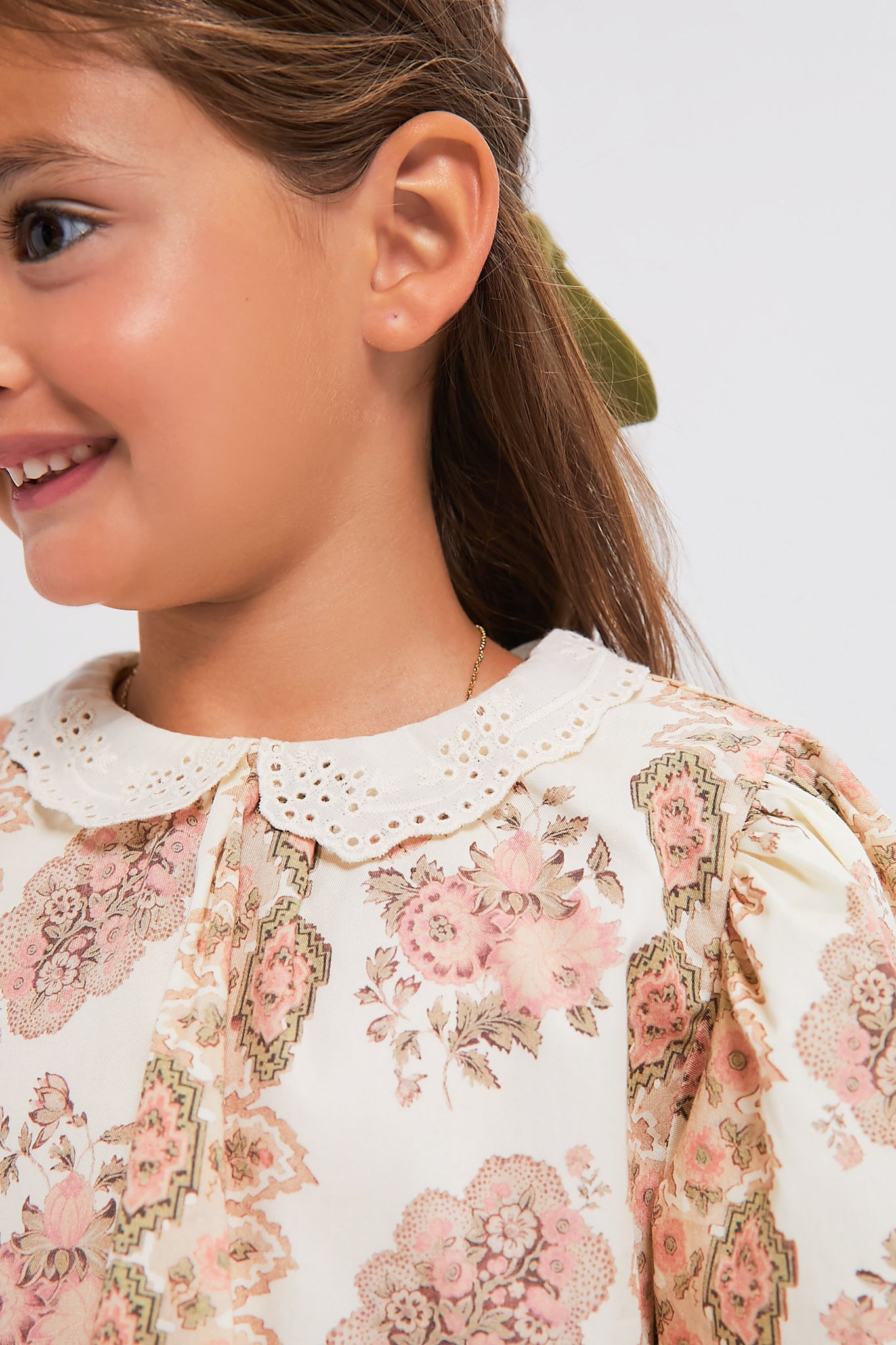 Crafted from softest cotton with in most beautiful nostalgic hues of ecru, pink and green, the Darja blouse features sweetest antique white embroidered collar, elegant long puff sleeves and ribbon ties in the back. Wear with jeans for a relaxed look or with a skirt for a more polished ensemble, this chic top is sure to become her favorite.