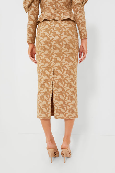 Stand out in style with the Taupe Augustine Skirt. Cut to a slim pencil silhouette that skims the body and hits mid-calf, this midi has a flattering high rise and a back vent for ease of movement. The warm jacquard wool fabric makes it a great go-to for cold-weather parties, and the unique embossed pattern effortlessly exudes elegance. We are pairing this with the Taupe Augustine Top for a chic matching set, or with a silk blouse and gold stilettos for a dinner party look.