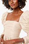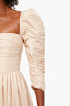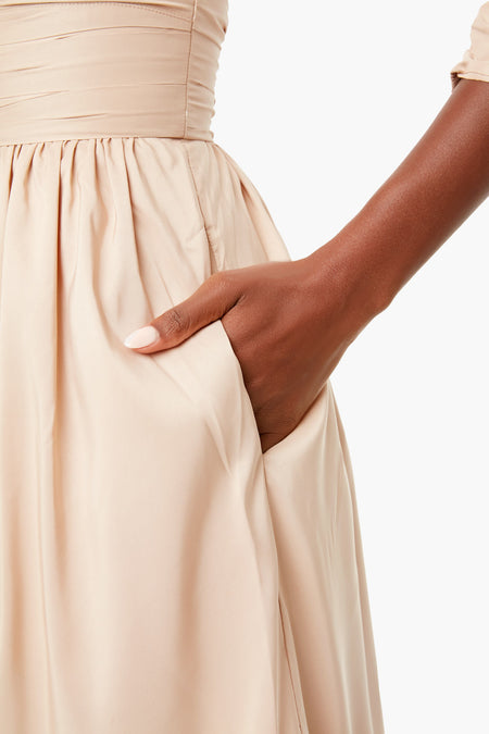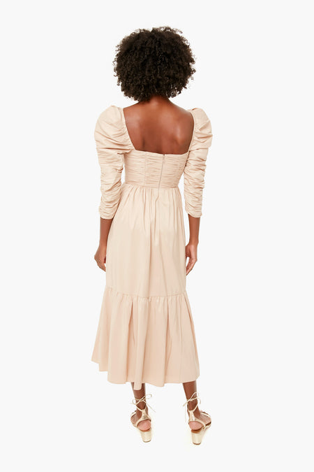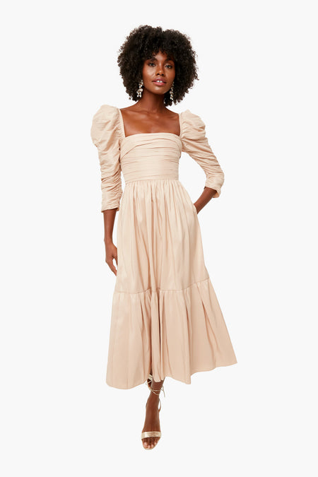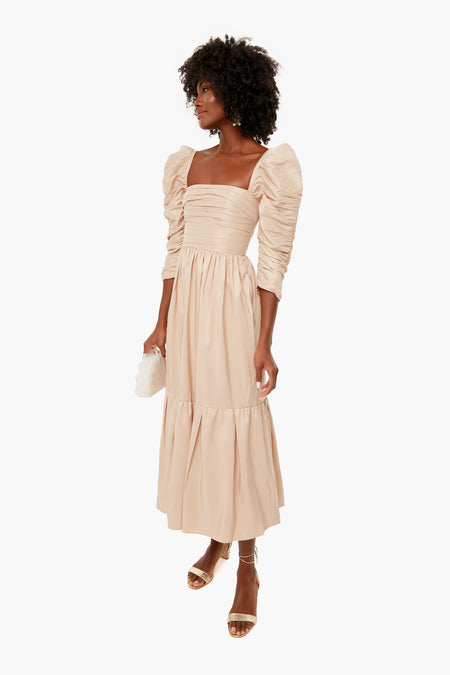 The Taupe Taffeta Midi Dress features a flattering square neckline, statement puff sleeves, and side pockets. Fitted at the waist, this style falls to a full midi skirt. Add gold accessories for a look that is sure to make you the best-dressed guest.