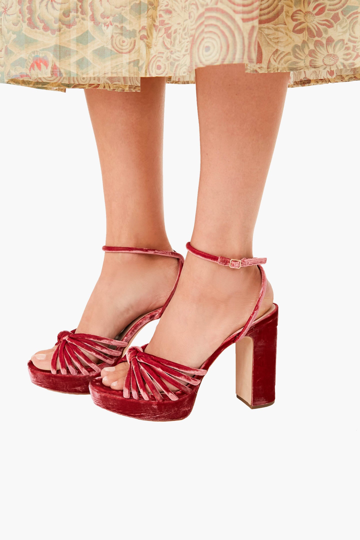 The Tea Rose Velvet Rika Heels make a statement and are a must-have for any wardrobe. In a beautiful neutral pink hue, these shoes feature a strappy platform toe with a knotted detail, an ankle strap, and a block heel. Wear with denim and a fun blouse for a chic look to grab drinks with the girls, or pair with a midi dress for glitzy social occasions.