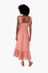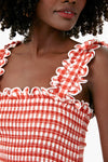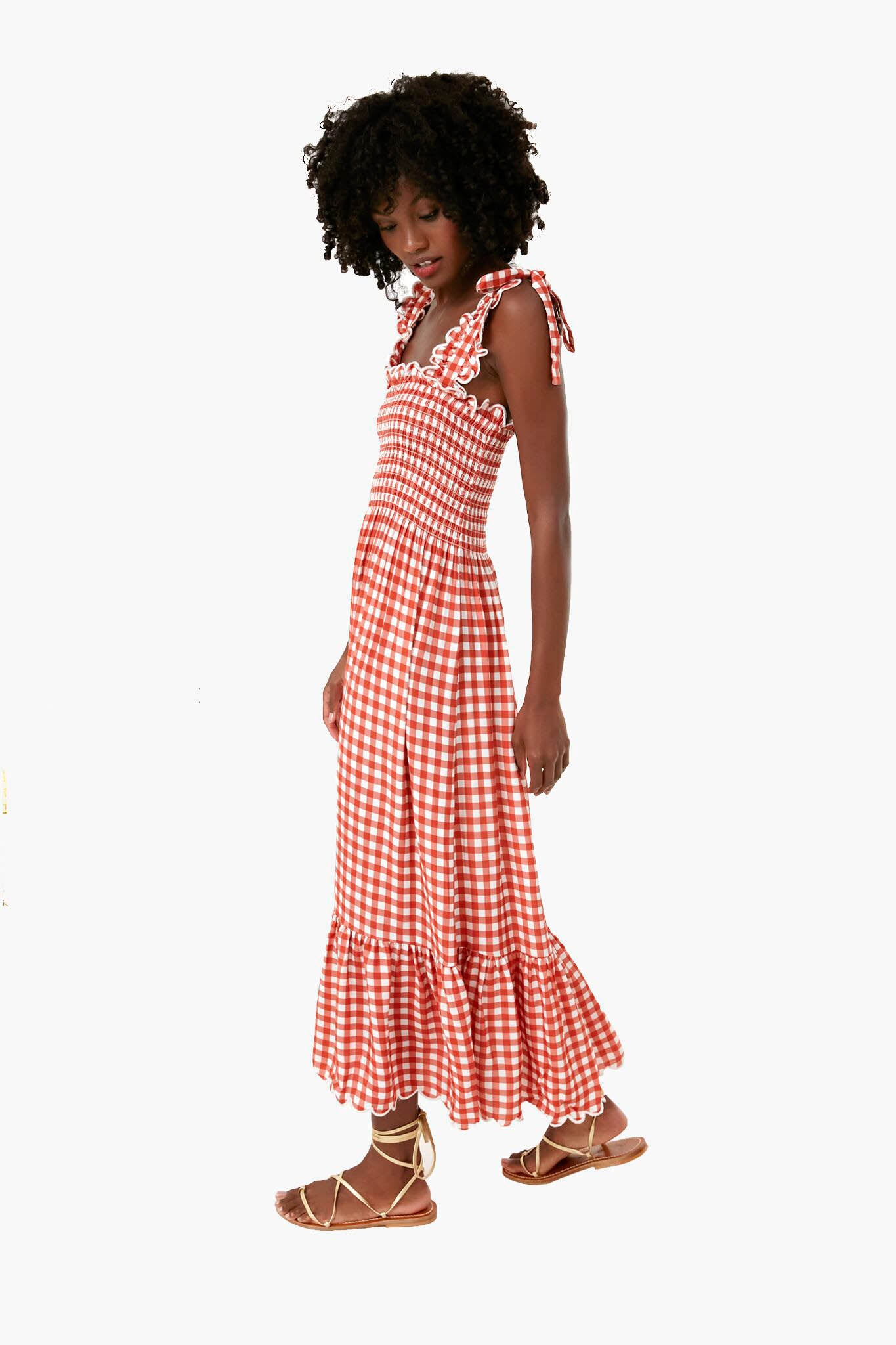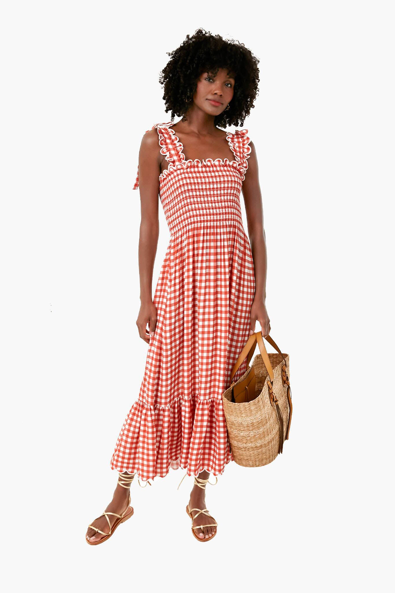 Cut from gingham-printed crepe material, the Terracotta Gingham Midi Dress has an easy, summery silhouette with a smocked bodice and self-tying shoulder straps. Detailing such as the embroidered scallop hems throughout make for a fun and flirty outfit you can wear all season long. Layer it over a swimsuit and a fresh tan on your way to the coast, or add jewelry and sandals to go directly from the ocean to waterfront dining.