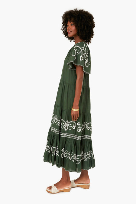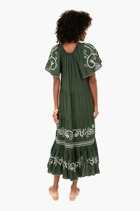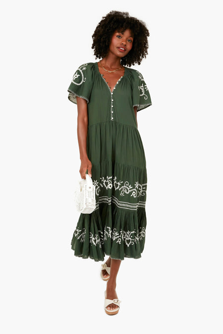 Feminine with a Western touch, The Dark Forest Iris Dress features a split neckline with buttons, embroidered detailing, and a tiered skirt. Wear this number three seasons a year, from farmers market runs to hosting dinners al fresco. We are pairing this with sandals, a statement bag, and gold accessories.