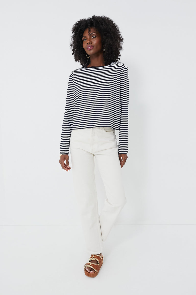 A slightly cropped version of the brand's best-selling Modern tee, the Navy and White Venice Tee is all kinds of cool and classic. Perfect for adding to your rotation, this all-season staple is complete with a contrasting round neckline, long sleeves, and a slightly boxy fit for a casual feel. Pair with denim and sneakers for running errands or exploring a new city, style it with a mini skirt and flats for brunch, or under a jacket for chilly weather.