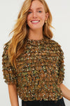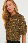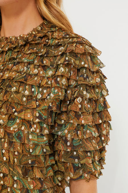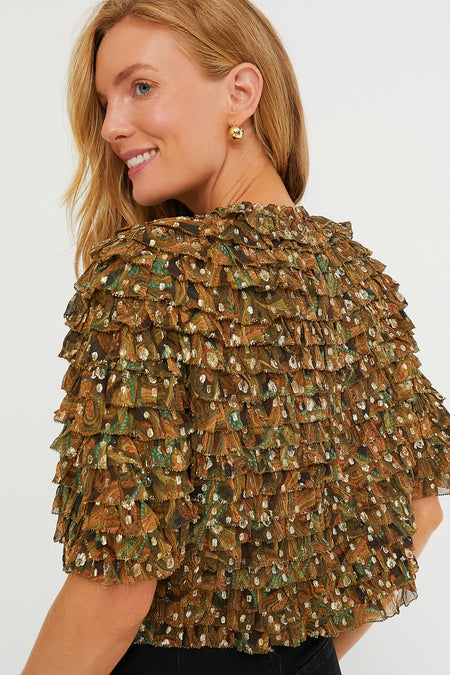 The Tiger’s Eye Carmella Blouse will make you feel fabulous all day long. Featuring a fun ruffle tiered crinkle chiffon, lurex dot’s, and a center back zipper, perfect for your next formal family dinner. Styled with brown slacks for a monochromatic moment or with a metallic midi skirt and boots for a show stopping outfit.