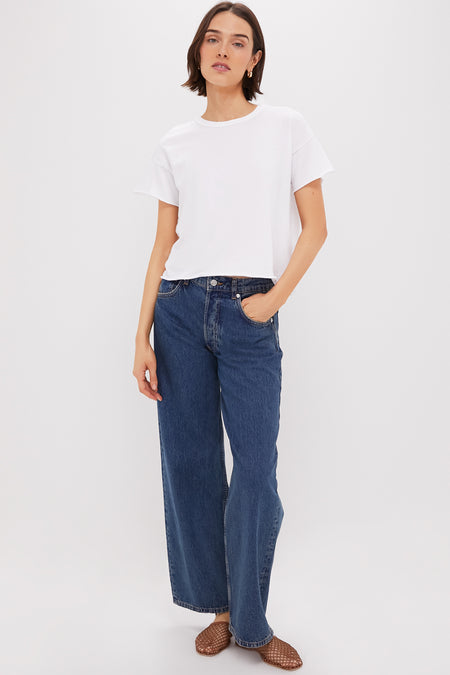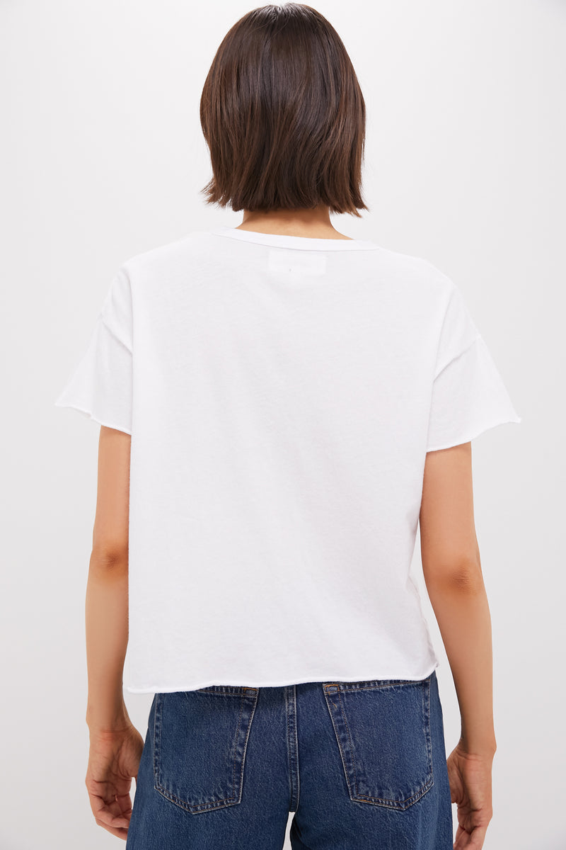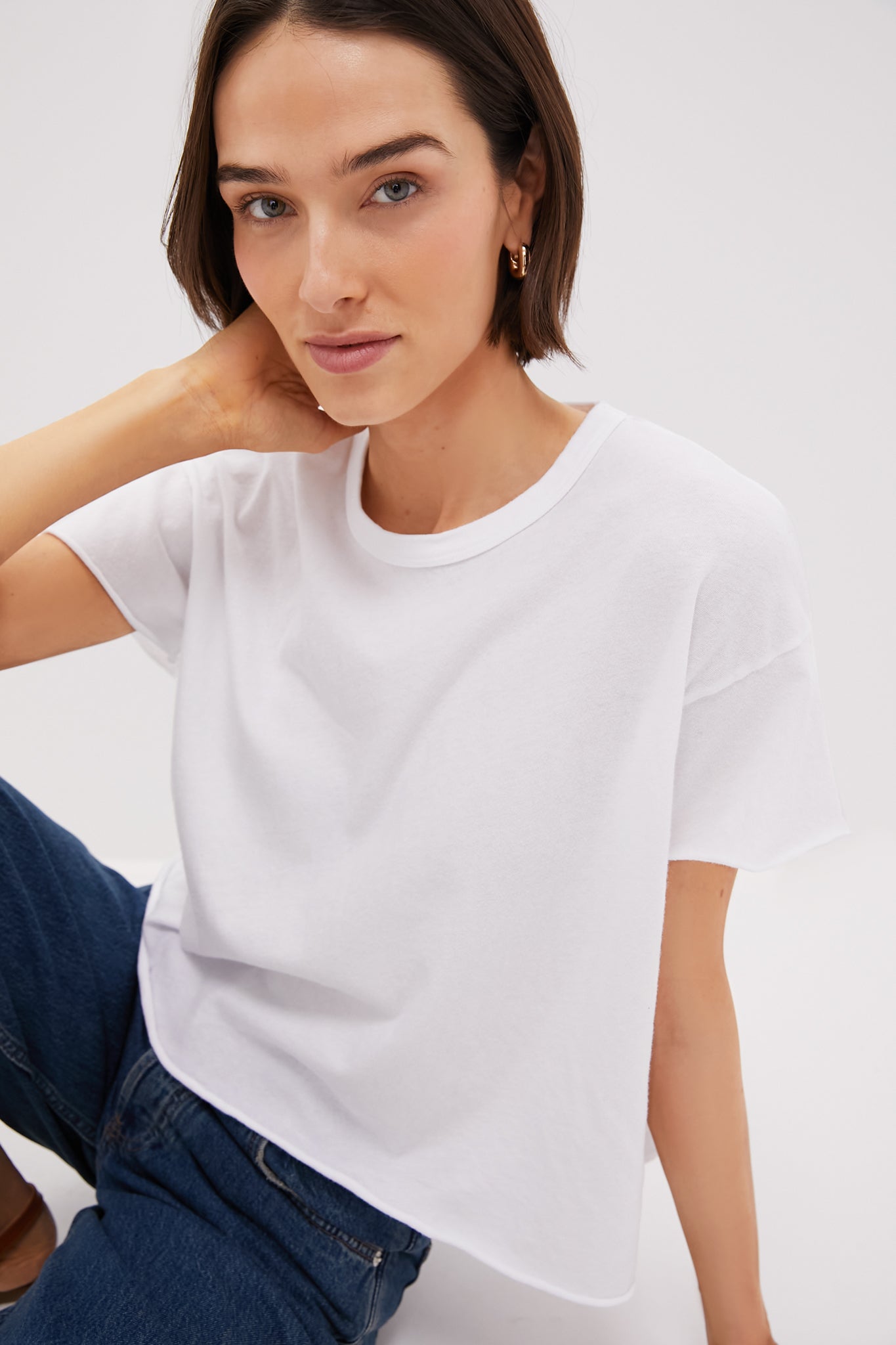 Cut cropped and boxy, this top is made from super soft cotton with a lived-in wash. This tee looks great with a high-rise jean, feminine skirts, or layered under a lightweight jacket.